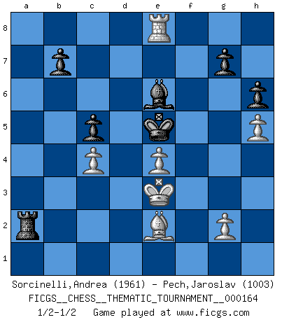 Last move : 1/2-1/2 2013 December 24 0:29:35 [Event "FICGS__CHESS__THEMATIC_TOURNAMENT__000164"] [Site "FICGS"] [Date "2013.05.21"] [Round "1"] [White "Sorcinelli,Andrea"] [Black "Pech,Jaroslav"] [Result "1/2-1/2"] [WhiteElo "1961"] [BlackElo "1003"] 1.b4 e5 2.a3 d5 3.Bb2 Bd6 4.e3 Nf6 5.c4 c6 6.d3 O-O 7.Nf3 Nbd7 8.Be2 a5 9.O-O axb4 10.axb4 Rxa1 11.Bxa1 Bxb4 12.Nxe5 Nxe5 13.Bxe5 dxc4 14.dxc4 Qxd1 15.Rxd1 Be6 16.Bc3 Bxc3 17.Nxc3 Ra8 18.Rb1 Ra7 19.f3 Kf8 20.Rb2 Nd7 21.Ne4 f5 22.Nd6 Nc5 23.e4 fxe4 24.Nxe4 Nxe4 25.fxe4 Ke7 26.Kf2 Kd6 27.Ke3 Ke5 28.h4 h6 29.h5 Bf7 30.Rb1 Ra3+ 31.Kd2 Ra2+ 32.Ke3 Ra3+ 33.Kd2 Ra7 34.Ke3 Be6 35.Rb2 Bd7 36.Rb3 Bc8 37.Rd3 Be6 38.Rd8 Ra3+ 39.Kf2 Ra2 40.Re8 c5 41.Ke3 1/2-1/2 Polish (Sokolsky) opening Kingside Castling by player Black (move 6) Kingside Castling by player White (move 9) This chess game ended in a draw. Follow this game move after move (download)In life, as in Chess, one's own Pawns block one's way. A man's very wealth, ease, leisure, children, books, which should help him to win, more often checkmate him. (Charles Buxton) Der Partner hat auch seine Existenzberechtigung. (Savielly Grigorievitsch Tartakower) Los finales de Peón son del Ajedrez lo que el cesped es del Golf. (Cecil Purdy) Avec des compensations pour le matériel en plus... (Anonyme) The intuitive mind is a sacred gift; the rational mind is a faithful servant. We have created a society that honors the servant but has forgotten the gift. (Albert Einstein)