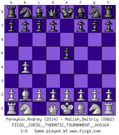 Last move : 1-0 2013 June 30 14:37:41 [Event "FICGS__CHESS__THEMATIC_TOURNAMENT__000164"] [Site "FICGS"] [Date "2013.05.21"] [Round "1"] [White "Permykov,Andrey"] [Black "Malish,Dmitriy"] [Result "1-0"] [WhiteElo "2014"] [BlackElo "0862"] 1.b4 e5 2.Bb2 1-0 This chess game has been lost on time (started : 2013.05.21 13:52:41) Polish (Sokolsky) opening Player White won this chess game. Follow this game move after move (download)Via the squares on the chessboard, the Indians explain the movement of time and the age, the higher influences which control the world and the ties which link Chess with the human soul. (Al-Masudi) Der zweitbeste Zug ist oft der einzig richtige. (Savielly Grigorievitsch Tartakower) El Ajedrez te enseña a controlarl la excitación inicial que sientes cuando vez algo que parece bueno y te enseña a pensar objetivamente cuando te encuentras en problemas. (Stanley Kubrick) Le profane ne songe pas à la somme de jouissance dont il se prive, qui méconnaît ce jeu aux ressources aussi variées que passionnantes. (Jean-Marie Jeanton-Lamarche) I just play for fun. (Anna Kournikova)