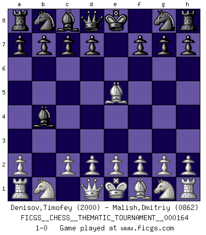 Last move : 1-0 2013 June 30 14:37:41 [Event "FICGS__CHESS__THEMATIC_TOURNAMENT__000164"] [Site "FICGS"] [Date "2013.05.21"] [Round "1"] [White "Denisov,Timofey"] [Black "Malish,Dmitriy"] [Result "1-0"] [WhiteElo "2000"] [BlackElo "0862"] 1.b4 e5 2.Bb2 Bxb4 3.Bxe5 1-0 This chess game has been lost on time (started : 2013.05.21 13:52:41) Polish (Sokolsky) opening Player White won this chess game. Follow this game move after move (download)Kasparov : J'adoube , Ivanchuk : S'il vous plaît ! (Garry Kasparov & Vassily Ivanchuk, Linares 1997) Die Jungen erwarten, dass Opa einfach umfällt. Dann aber kann Opa fünf Stunden lang Schach spielen und die jungen Gegner an die Wand drücken. (Viktor Kortschnoi) Yo adoro todas la posiciones. Denme una partida posicional difÃcil, y la jugaré. Pero posiciones totalmente ganadas, no las tolero. (Hein Donner) Le temps de noter son nom sur la feuille de partie, j'étais déjà en zeitnot ! D'un modeste amateur apparié lors de la première ronde d'un open contre le grand-maître Azmaïparashvili. The question of whether computers can think is just like question of whether submarines can swim. (Edsger W. Dijkstra)