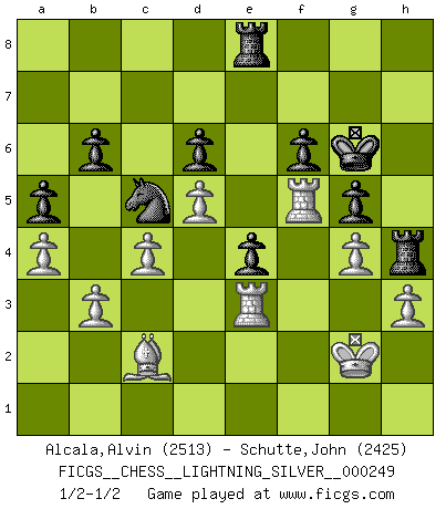 Last move : 1/2-1/2 2013 May 22 17:55:6 [Event "FICGS__CHESS__LIGHTNING_SILVER__000249"] [Site "FICGS"] [Date "2013.05.22"] [Round "1"] [White "Alcala,Alvin"] [Black "Schutte,John"] [Result "1/2-1/2"] [WhiteElo "2513"] [BlackElo "2425"] 1.e4 c5 2.Nf3 d6 3.d4 cxd4 4.Nxd4 Nf6 5.Nc3 a6 6.Be3 e5 7.Nb3 Be6 8.f3 h5 9.Qd2 Nbd7 10.Nd5 Bxd5 11.exd5 g6 12.Be2 Bg7 13.O-O b6 14.c4 O-O 15.Qe1 a5 16.Qf2 Nc5 17.Rae1 Nfd7 18.Nxc5 Nxc5 19.g4 Bf6 20.Rd1 hxg4 21.fxg4 Kg7 22.Bd3 Bg5 23.Bc2 Rb8 24.a4 Bxe3 25.Qxe3 Qh4 26.h3 Rbe8 27.Kg2 e4 28.Rf4 f6 29.Rdf1 Rf7 30.Qg3 Rh8 31.Qxh4 Rxh4 32.Kg3 g5 33.Rf5 Rf8 34.Kg2 Rh6 35.Re1 Rh7 36.Ref1 R7h8 37.b3 Rh6 38.Re1 Re8 39.Re3 Rh4 40.Kg3 Reh8 41.Kg2 Kf7 42.Rf1 Re8 43.Rf5 Kg6 44.Rf1 Re7 45.Rf5 Re8 1/2-1/2 Sicilian : Najdorf, Byrne (English) attack Kingside Castling by player White (move 13) Kingside Castling by player Black (move 14) This chess game ended in a draw. Follow this game move after move (download)Fischer is the strongest player in the world. In fact, the strongest player who ever lived. (Larry Evans) Gegen einen Schachcomputer zu verlieren ist wie Löcher in den Strümpfen zuhaben. Es ist nicht peinlich, solange man der einzige ist der es weiß. (Anonymous) Bobby solo arroja las piezas y solas caen en las casillas correctas. (Miguel Najdorf ) Vouloir jouer aux échecs contre soi-même est aussi paradoxal que vouloir marcher sur son ombre. (Stefan Zweig) Empty your mind, be formless, shapeless — like water. (Bruce Lee)