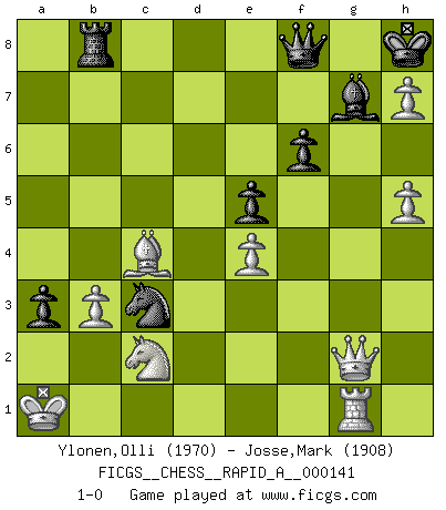 Last move : 1-0 2013 August 24 10:10:26 [Event "FICGS__CHESS__RAPID_A__000141"] [Site "FICGS"] [Date "2013.05.22"] [Round "1"] [White "Ylonen,Olli"] [Black "Josse,Mark"] [Result "1-0"] [WhiteElo "1970"] [BlackElo "1908"] 1.e4 c5 2.Nf3 d6 3.d4 cxd4 4.Nxd4 Nf6 5.Nc3 a6 6.Be3 e5 7.Nb3 Be6 8.f3 Be7 9.Qd2 O-O 10.O-O-O Nbd7 11.g4 b5 12.g5 b4 13.Ne2 Ne8 14.f4 a5 15.f5 a4 16.Nbd4 exd4 17.Nxd4 b3 18.Kb1 bxc2+ 19.Nxc2 Bxa2+ 20.Kxa2 Ne5 21.h4 Qb8 22.Rh3 Nc7 23.Bf4 Rc8 24.Rc3 Bf8 25.Bxe5 dxe5 26.Bc4 a3 27.b3 Kh8 28.Bxf7 Be7 29.f6 gxf6 30.g6 Bf8 31.gxh7 Nb5 32.Rxc8 Qxc8 33.Bc4 Rb8 34.Qg2 Bg7 35.Rg1 Qf8 36.h5 Nc3+ 37.Ka1 1-0 Sicilian : Najdorf, Byrne (English) attack Kingside Castling by player Black (move 9) Queenside Castling by player White (move 10) Player White won this chess game. Follow this game move after move (download)The Pin is mightier than the sword. (Fred Reinfeld) Schach ist das Spiel, das die Verrückten gesund hält. (Albert Einstein) El Ajedrez expande y enriquece tu mente. (Saudin Robovic) Toute estimation doit être constamment réévaluée. (Jacob Estrin) If things go wrong, don't go with them. (Roger Babson)