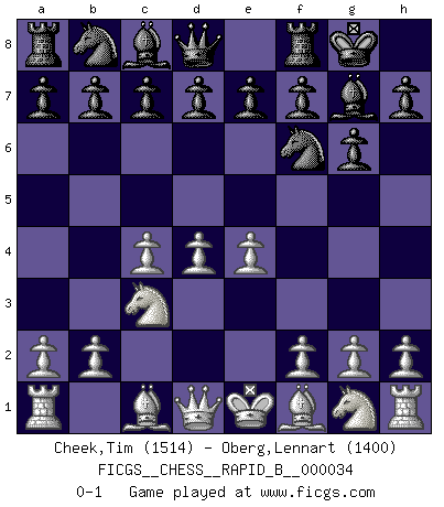 Last move : 0-1 2007 March 9 1:2:13 [Event "FICGS__CHESS__RAPID_B__000034"] [Site "FICGS"] [Date "2007.01.31"] [Round "1"] [White "Cheek,Tim"] [Black "Oberg,Lennart"] [Result "0-1"] [WhiteElo "1514"] [BlackElo "1400"] 1.d4 Nf6 2.c4 g6 3.Nc3 Bg7 4.e4 O-O 0-1 This chess game has been lost on time (started : 2007.01.31 0:54:53) King's Indian : 4.e4 Kingside Castling by player Black (move 4) Player Black won this chess game. Follow this game move after move (download)Chess, like love, is infectious at any age. (Flohr) Mein erstes Ziel war nicht, die Partie zu gewinnen, sondern eine Figur zu opfern. -- der junge (Wilhelm Steinitz) El Ajedrez es realmente noventa y nueve por ciento calculación. (Soltis) 'L'échange des dames est un coup dur pour les deux adversaires...' Un journaliste lors d'une partie du match Spassky-Fischer The only difference between a tax man and a taxidermist is that the taxidermist leaves the skin. (Mark Twain)