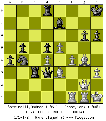 Last move : 1/2-1/2 2013 June 27 21:51:25 [Event "FICGS__CHESS__RAPID_A__000141"] [Site "FICGS"] [Date "2013.05.22"] [Round "1"] [White "Sorcinelli,Andrea"] [Black "Josse,Mark"] [Result "1/2-1/2"] [WhiteElo "1961"] [BlackElo "1908"] 1.d4 Nf6 2.c4 e6 3.g3 d5 4.Bg2 dxc4 5.Nf3 Bb4+ 6.Nbd2 O-O 7.O-O b5 8.a4 c6 9.axb5 cxb5 10.Nh4 Nd5 11.e4 Ne7 12.e5 Nbc6 13.Qg4 Kh8 14.Rd1 Nd5 15.Ne4 Bd7 16.Qh5 Be8 17.Ng5 h6 18.Nh3 f6 19.Ng6+ Bxg6 20.Qxg6 Nce7 21.Qg4 Qb6 22.Nf4 f5 23.Nxd5 exd5 24.Qh5 a5 25.Ra2 Qe6 26.Qf3 a4 27.Be3 Kg8 28.Qe2 Nc6 29.f4 Be7 30.Bf3 Qf7 31.Qg2 Rfd8 32.g4 Nb4 33.R2a1 Ra6 34.h3 Rc6 35.Kh1 Kh8 36.Rg1 g6 37.Raf1 c3 38.gxf5 Qxf5 39.bxc3 Rxc3 40.Bg4 Qd3 41.Be2 Qf5 42.Bg4 Qd3 1/2-1/2 Catalan : Open, 5.Nf3 Kingside Castling by player Black (move 6) Kingside Castling by player White (move 7) This chess game ended in a draw. Follow this game move after move (download)It is always better to sacrifice your opponent's men. (Savielly Tartakower) Er war ein guter Schachspieler, aber ich kann Leute nicht ausstehen, die 'Heil Hitler' rufen (Über Alexander Aljechin). (Miguel Najdorf) Cuando veas una buena jugada, trata de encontrar otra mejor. (Emanuel Lasker) Vous savez, camarade Pachman, je n'éprouve pas de plaisir à être ministre, je jouerais plutôt aux échecs comme vous, ou alors ferais une révolution au Venezuela. (Che Guevara à Ludek Pachman, 'Checkmate in Prague', 1975) I find your interest interesting. (Gregory House, House M.D.)