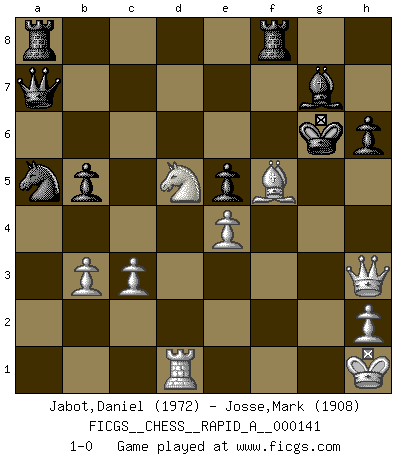 Last move : 1-0 2013 August 31 11:19:51 [Event "FICGS__CHESS__RAPID_A__000141"] [Site "FICGS"] [Date "2013.05.22"] [Round "1"] [White "Jabot,Daniel"] [Black "Josse,Mark"] [Result "1-0"] [WhiteElo "1972"] [BlackElo "1908"] 1.e4 c5 2.Nf3 d6 3.d4 cxd4 4.Nxd4 Nf6 5.Nc3 a6 6.Bg5 e6 7.f4 h6 8.Bh4 Qb6 9.a3 Be7 10.Bf2 Qc7 11.g3 Nc6 12.Bg2 O-O 13.O-O Bd7 14.Nb3 Rac8 15.Na4 b5 16.Nb6 Rb8 17.Nxd7 Nxd7 18.c3 Nb6 19.Qe2 Rfe8 20.Rad1 Nc4 21.Nc1 e5 22.a4 exf4 23.gxf4 Bf6 24.Na2 Rec8 25.Kh1 g6 26.axb5 axb5 27.b3 N4a5 28.Bg3 Rd8 29.Qf3 Rbc8 30.Nb4 Bg7 31.Nd5 Qb7 32.Bh3 Ra8 33.f5 Ne5 34.Bxe5 dxe5 35.fxg6 fxg6 36.Be6+ Kh7 37.Rg1 Rf8 38.Qh3 Qa7 39.Rxg6 Kxg6 40.Bf5+ 1-0 Sicilian : Najdorf, 7.f4 Kingside Castling by player Black (move 12) Kingside Castling by player White (move 13) Player White won this chess game. Follow this game move after move (download)The passed pawn is a criminal, who should be kept under lock and key. Mild measures, such as police surveillance, are not sufficient. (Nimzovitch) Ich habe kein Problem mit Frauen, sondern nur mit dem Niveau ihres Schachspiels (Judith Polgar) Creo que una cierta cantidad de temperamento es esperada de los genios del Ajedrez. (Ron Gross) Karpov est une pièce de musée. (Garry Kasparov) I feel so... helpless. (C-3PO in Star Wars ep.3)