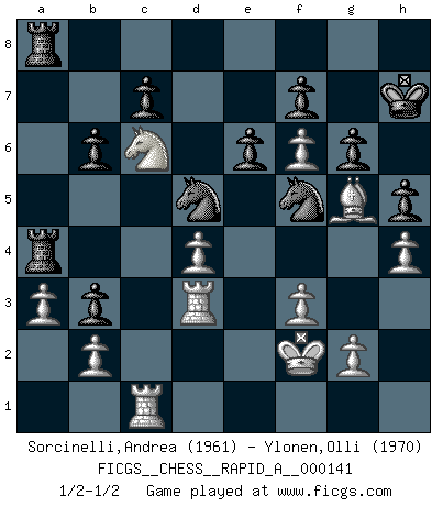 Last move : 1/2-1/2 2013 September 3 21:28:19 [Event "FICGS__CHESS__RAPID_A__000141"] [Site "FICGS"] [Date "2013.05.22"] [Round "1"] [White "Sorcinelli,Andrea"] [Black "Ylonen,Olli"] [Result "1/2-1/2"] [WhiteElo "1961"] [BlackElo "1970"] 1.d4 Nf6 2.c4 g6 3.Nc3 d5 4.e3 Bg7 5.Qb3 dxc4 6.Bxc4 O-O 7.Nf3 Nc6 8.Be2 b6 9.O-O Bb7 10.Rd1 e6 11.e4 Na5 12.Qc2 Qe7 13.e5 Nd5 14.Ne4 Qd7 15.Bd2 Nc6 16.Rac1 Nce7 17.h4 h5 18.Bg5 Nf5 19.a3 a5 20.Bc4 a4 21.Qd3 Qc8 22.Nf6+ Bxf6 23.exf6 Ba6 24.Ne5 Bxc4 25.Qxc4 Qa6 26.Qc2 Qb5 27.Nc6 Kh7 28.Rd2 Qb3 29.Qxb3 axb3 30.f3 Ra4 31.Rd3 Rfa8 32.Kf2 1/2-1/2 King's Indian defense, 3.Nc3 Kingside Castling by player Black (move 6) Kingside Castling by player White (move 9) This chess game ended in a draw. Follow this game move after move (download)Castle early and often. (Rob Sillars) Garry Kasparov war erst in der Großmeister-Organisation GMA, dann in der Profischach-Vereinigung PCA, zum Schluss kehrte er wieder in den Schoß der FIDE zurück. Aber gut, manche Leute sind flexibel (Viswanathan Anand) El Ajedrez es un terrible juego. Si no controlas el centro, tu oponente tiene una posición mas holgada. Si tienes control del centro, ¡entonces realmente tu tienes algo de que preocuparte!. (Siegbert Tarrasch) Nous vivons dans un monde échiquéen : chaque jour qui passe est un défi à relever. (Philosophe Sasha) Wisdom is the reward you get for a lifetime of listening when you'd have preferred to talk. (Doug Larson)