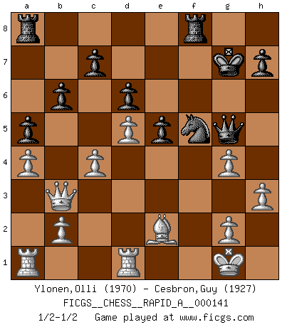 Last move : 1/2-1/2 2013 August 14 0:49:38 [Event "FICGS__CHESS__RAPID_A__000141"] [Site "FICGS"] [Date "2013.05.22"] [Round "1"] [White "Ylonen,Olli"] [Black "Cesbron,Guy"] [Result "1/2-1/2"] [WhiteElo "1970"] [BlackElo "1927"] 1.e4 d6 2.d4 Nf6 3.Nc3 g6 4.Nf3 Bg7 5.Be2 O-O 6.O-O Bg4 7.h3 Bxf3 8.Bxf3 Nc6 9.Ne2 e5 10.c3 Kh8 11.Qb3 b6 12.d5 Ne7 13.Rd1 Nfg8 14.Ng3 f5 15.a4 a5 16.exf5 gxf5 17.Be2 Nf6 18.Bg5 f4 19.Bxf6 fxg3 20.Bxg7+ Kxg7 21.fxg3 Nf5 22.c4 Qg5 23.g4 1/2-1/2 Pirc : Classical system, 5.Be2 Kingside Castling by player Black (move 5) Kingside Castling by player White (move 6) This chess game ended in a draw. Follow this game move after move (download)A Chess game is divided into three stages: the first, when you hope you have the advantage, the second when you believe you have an advantage, and the third... when you know you're going to lose ! (Savielly Tartakower) Ich kenne Menschen, die allen Willen der Welt besitzen und doch nicht Schach spielen können. (Robert James Fischer) Mis oponentes también hacen buenas movidas. A veces yo no tomo esas cosas en consideración. (Bobby Fischer) La guerre est enfant de la passion, la passion est enfant du narcissisme et le narcissisme est l'enfant. (...) Une autre partie ? (Thibault de Vassal) They say poker is a zero-sum game. It must be, because every time I play my sum ends up zero. (Max Shapiro)