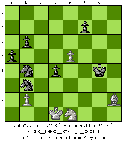 Last move : 0-1 2013 November 7 8:55:9 [Event "FICGS__CHESS__RAPID_A__000141"] [Site "FICGS"] [Date "2013.05.22"] [Round "1"] [White "Jabot,Daniel"] [Black "Ylonen,Olli"] [Result "0-1"] [WhiteElo "1972"] [BlackElo "1970"] 1.e4 c6 2.d4 d5 3.exd5 cxd5 4.Nf3 Nc6 5.Bb5 Bg4 6.Nbd2 e6 7.c4 Bd6 8.Qa4 Nge7 9.cxd5 exd5 10.Ne5 Bxe5 11.dxe5 d4 12.O-O O-O 13.h3 Be6 14.Nf3 Qb6 15.Rd1 Rfd8 16.Bf4 h6 17.Bh2 Rd5 18.Bc4 Ra5 19.Qb3 Qxb3 20.axb3 Rxa1 21.Rxa1 a6 22.Ne1 Rc8 23.Nd3 Nd8 24.Bxe6 Nxe6 25.Rc1 Rxc1+ 26.Nxc1 Nc5 27.Kf1 Nc6 28.Ke2 g5 29.f3 Kg7 30.g4 b6 31.f4 gxf4 32.Bxf4 Kg6 33.Kd2 h5 34.Kc2 hxg4 35.hxg4 Nb4+ 36.Kd2 Ne6 37.Bh2 Kg5 38.Nd3 Nc6 39.Nf2 Nc5 40.Kc2 a5 41.Nd3 Kxg4 42.Ne1 Nb4+ 43.Kd1 Nxb3 0-1 Caro-Kann : Exchange variation Kingside Castling by player White (move 12) Kingside Castling by player Black (move 12) Player Black won this chess game. Follow this game move after move (download)Botvinnik tried to take the mystery out of Chess, always relating it to situations in ordinary life. He used to call Chess a typical inexact problem similar to those which people are always having to solve in everyday life. (Garry Kasparov) Über Kasparov: Es ist offensichtlich, daß er in einem totalitären Staat aufwuchs und deshalb zu diktatorischen Zügen neigt. (Viktor Kortschnoi) Aquel que teme a un Peón de Reina aislado, debería de retirarse del Ajedrez. (Siegbert Tarrasch) Assurément je connaissais par expérience le mystérieux attrait de ce jeu royal, le seul entre tous les jeux inventés par les hommes qui échappe souverainement à la tyrannie du hasard, le seul où l'on ne doive sa victoire qu'à son intelligence ou plutôt à une certaine forme d'intelligence. Mais n'est-ce pas déjà le limiter injurieusement que d'appeler les échecs un jeu ? N'est-ce pas une science, un art ou quelque chose qui, comme le cercueil de Mahomet entre ciel et terre, est suspendu entre l'un et l'autre, et qui réunit un nombre incroyable de contraires ? [...] C'est une pensée qui ne mène à rien, une mathématique qui n'établit rien, un art qui ne laisse pas d'uvre, une architecture sans matière; et il l'a prouvé néanmoins qu'il était plus durable, à sa manière, que les livres ou que tout autre monument, ce jeu unique qui appartient à tous les peuples et à tous les temps, et dont personne ne sait quel dieu en fit don à la terre pour tuer l'ennui, pour aiguiser l'esprit et stimuler l'âme. Où commence-t-il, où finit-il ? (Stefan Zweig) Men should grow up. - Yeah. And dogs should stop licking themselves. It's not gonna happen. (Gregory House to Dr. Cameron, House M.D.)