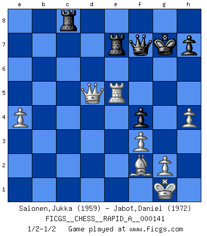 Last move : 1/2-1/2 2013 August 12 11:24:16 [Event "FICGS__CHESS__RAPID_A__000141"] [Site "FICGS"] [Date "2013.05.22"] [Round "1"] [White "Salonen,Jukka"] [Black "Jabot,Daniel"] [Result "1/2-1/2"] [WhiteElo "1959"] [BlackElo "1972"] 1.d4 Nf6 2.c4 g6 3.Nc3 Bg7 4.Nf3 d6 5.e4 O-O 6.Be2 Nc6 7.d5 Ne5 8.Nxe5 dxe5 9.Be3 e6 10.O-O exd5 11.cxd5 Ne8 12.Rc1 a6 13.Bd3 f5 14.exf5 gxf5 15.d6 cxd6 16.Bc4+ Kh8 17.f3 f4 18.Bf2 Bf5 19.Qb3 Rc8 20.Bd5 Nf6 21.Qxb7 Rb8 22.Qxa6 Nxd5 23.Nxd5 Rxb2 24.Qa3 Rb7 25.Rc6 Rg8 26.Qa6 Rf7 27.Rxd6 Qg5 28.h4 Qh5 29.Be1 Bf8 30.Rf2 Bc8 31.Qc6 Bb7 32.Qb6 Bxd6 33.Qxd6 Bxd5 34.Qxd5 Rc8 35.Re2 Re7 36.a4 Kg7 37.Bf2 Qf7 38.Rxe5 1/2-1/2 King's Indian defense, 3.Nc3 Kingside Castling by player Black (move 5) Kingside Castling by player White (move 10) This chess game ended in a draw. Follow this game move after move (download)Different people feel differently about resigning. (Bobby Fischer) Ohne ihre Erfolge schmälern zu wollen würde ich sagen Petrosian, Spassky und Karpov verdanken ihre Siege ihren Trainern - Boleslavsky, Bondarevsky und Furman. (Mikhail Moiseyevich Botvinik) Tu cuerpo tiene que estar en óptima condición. Tu Ajedrez se deteriora como lo hace tu cuerpo. No puedes separar la mente y el cuerpo. (Bobby Fischer) Le système Elo représente seulement une moyenne. Il est simplement un indicateur de votre stabilité. (Anatoli Karpov) There is no instance of a country having benefited from prolonged warfare. (Sun Tzu)