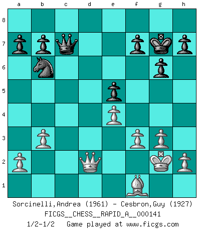 Last move : 1/2-1/2 2013 July 8 0:43:8 [Event "FICGS__CHESS__RAPID_A__000141"] [Site "FICGS"] [Date "2013.05.22"] [Round "1"] [White "Sorcinelli,Andrea"] [Black "Cesbron,Guy"] [Result "1/2-1/2"] [WhiteElo "1961"] [BlackElo "1927"] 1.d4 Nf6 2.c4 g6 3.Nc3 d5 4.Nf3 Bg7 5.e3 O-O 6.cxd5 Nxd5 7.Bc4 Nb6 8.Be2 c5 9.O-O cxd4 10.Nxd4 Bd7 11.e4 Nc6 12.Nxc6 Bxc6 13.Qb3 e6 14.Be3 Qe7 15.f3 Rfd8 16.Rad1 Rac8 17.Nb5 Bxb5 18.Qxb5 Rxd1 19.Rxd1 Rd8 20.Rxd8+ Qxd8 21.Kf1 Bd4 22.Qd3 e5 23.b3 Qf6 24.g3 Bxe3 25.Qxe3 Qd6 26.Qd3 Qc7 27.Qd2 Nd7 28.Kg2 Kg7 29.Bc4 Nb6 30.Bf1 1/2-1/2 King's Indian defense, 3.Nc3 Kingside Castling by player Black (move 5) Kingside Castling by player White (move 9) This chess game ended in a draw. Follow this game move after move (download)Becoming successful at Chess allows you to discover your own personality. That's what I want for the kids I teach. (Saudin Robovic) Ein Isolani verdüstert die Stimmung auf dem ganzen Schachbrett. (Savielly Grigorievitsch Tartakower) No hay un Gran Maestro de Ajedrez que sea normal; solo se diferencían ellos por la magnitud de su locura. (Viktor Korchnoi) Il vaut toujours mieux jouer un plan faux de façon logique que de n'avoir pas de plan du tout. (Victor Kortchnoï) Imagination is more important than knowledge. Knowledge is limited. Imagination encircles the world. (Albert Einstein)