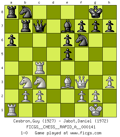 Last move : 1-0 2013 July 29 9:0:34 [Event "FICGS__CHESS__RAPID_A__000141"] [Site "FICGS"] [Date "2013.05.22"] [Round "1"] [White "Cesbron,Guy"] [Black "Jabot,Daniel"] [Result "1-0"] [WhiteElo "1927"] [BlackElo "1972"] 1.e4 c5 2.Nf3 d6 3.d4 cxd4 4.Nxd4 Nf6 5.Nc3 a6 6.Be3 b5 7.a4 bxa4 8.Rxa4 e6 9.Bb5+ Bd7 10.O-O Be7 11.Qe2 O-O 12.Bxd7 Qxd7 13.Rfa1 Rc8 14.h3 Rc7 15.Qf3 Rb7 16.Nb3 Qc7 17.e5 dxe5 18.Rc4 1-0 Sicilian : Najdorf, Byrne (English) attack Kingside Castling by player White (move 10) Kingside Castling by player Black (move 11) Player White won this chess game. Follow this game move after move (download)Spassky will not be psyched out by Fischer. (Mike Goodall) Heutzutage gewinnt im Turnier nicht derjenige Spieler, der weitreichende Pläne entwirft, sondern einfach jener, der Zug um Zug kämpft. (David Bronstein) Creo que una cierta cantidad de temperamento es esperada de los genios del Ajedrez. (Ron Gross) On entre au jeu d'Echecs comme on entre en Religion. Pour le joueur d'Echecs, la partie d'Echecs c'est l'office, la messe, le défilé du 1er Mai, le dépôt de gerbe au Monument aux Morts. C'est un drame sacré. (Michel Roos) To err is human, but to really foul things up requires a computer. (Farmer's Almanac, 1978)