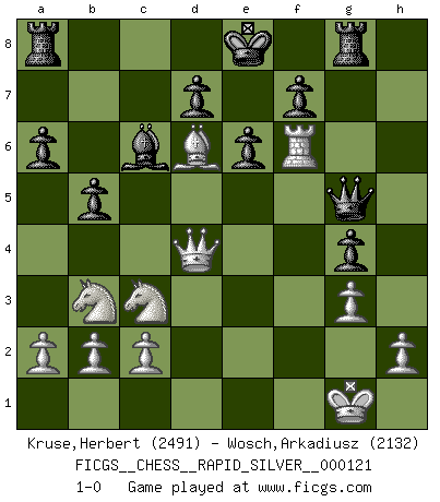 Last move : 1-0 2013 July 20 8:50:43 [Event "FICGS__CHESS__RAPID_SILVER__000121"] [Site "FICGS"] [Date "2013.05.26"] [Round "1"] [White "Kruse,Herbert"] [Black "Wosch,Arkadiusz"] [Result "1-0"] [WhiteElo "2491"] [BlackElo "2132"] 1.e4 c5 2.Nf3 e6 3.d4 cxd4 4.Nxd4 a6 5.Bd3 Bc5 6.Nb3 Ba7 7.O-O Nc6 8.Qg4 Nf6 9.Qxg7 Rg8 10.Qh6 Ne5 11.Be2 Nxe4 12.Qf4 Nxf2 13.Rxf2 Bxf2+ 14.Qxf2 b5 15.Bf4 Bb7 16.g3 Ng4 17.Qd4 Bc6 18.Nc3 h5 19.Rf1 Qe7 20.Bd6 Qg5 21.Bxg4 hxg4 22.Rf6 1-0 Sicilian : Kan, Polugaievsky variation Kingside Castling by player White (move 7) Player White won this chess game. Follow this game move after move (download)Live, lose, and learn, by observing your opponent how to win. (Amber Steenbock) Modernes Schach erfordert enorme Anspannung. Es ist für einen normalen Menschen unmöglich das auszuhalten. (Viktor Kortschnoi) Me dio la sensación de como si yo estuviera jugando en contra del mismo Ajedrez. - al estar jugando en contra de Robert Fischer (Walter Shipman) Toute estimation doit être constamment réévaluée. (Jacob Estrin) Somehow our devils are never quite what we expect when we meet them face to face. (Nelson DeMille)