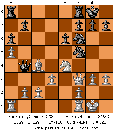 Last move : 1-0 2007 October 14 0:35:28 [Event "FICGS__CHESS__THEMATIC_TOURNAMENT__000022"] [Site "FICGS"] [Date "2007.01.31"] [Round "1"] [White "Porkolab,Sandor"] [Black "Pires,Miguel"] [Result "1-0"] [WhiteElo "2000"] [BlackElo "2160"] 1.e4 d5 2.exd5 Nf6 3.Bb5+ Bd7 4.Bc4 Bg4 5.Nf3 c6 6.dxc6 Nxc6 7.O-O e6 8.Nc3 Bd6 9.h3 Bxf3 10.Qxf3 O-O 11.d3 Nd4 12.Qd1 Bc7 13.Be3 Qd6 14.g3 Bb6 15.a4 Nf5 16.Nb5 Qc6 17.Bxb6 Qxb6 18.Qf3 a6 19.a5 Qc5 20.Nc3 Qb4 21.Ne4 1-0 This chess game has been lost on time (started : 2007.01.31 12:49:19) Scandinavian defense Kingside Castling by player White (move 7) Kingside Castling by player Black (move 10) Player White won this chess game. Follow this game move after move (download)The sign of a great Master is his ability to win a won game quickly and painlessly. (Irving Chernev) Kein Großmeister ist normal. Sie unterscheiden sich nur im Ausmaß Ihrer Verrücktheit. (Viktor Kortschnoi) Tu sabes, camarada Pachman, no disfruto el ser un Ministro, preferería jugar al Ajedrez como tu. (Che Guevara) En blitz, le Cavalier l'emporte sur le Fou. (Vlastimil Hort) If things go wrong, don't go with them. (Roger Babson)