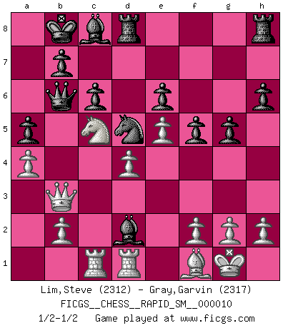 Last move : 1/2-1/2 2013 August 18 18:58:29 [Event "FICGS__CHESS__RAPID_SM__000010"] [Site "FICGS"] [Date "2013.05.27"] [Round "1"] [White "Lim,Steve"] [Black "Gray,Garvin"] [Result "1/2-1/2"] [WhiteElo "2312"] [BlackElo "2317"] 1.d4 d5 2.c4 e6 3.Nf3 Nf6 4.Nc3 c6 5.Bg5 dxc4 6.a4 Nbd7 7.e4 h6 8.Bxf6 Qxf6 9.e5 Qd8 10.Bxc4 Nb6 11.Bd3 Nd5 12.O-O a5 13.Qd2 Bd7 14.Ne4 Bb4 15.Qd1 Qb6 16.Rc1 O-O-O 17.Qc2 Kb8 18.Nc5 Bc8 19.Rfd1 Ne7 20.Qc4 Nd5 21.Bf1 f5 22.Nd2 g5 23.Qb3 Bxd2 1/2-1/2 Queen's gambit declined Kingside Castling by player White (move 12) Queenside Castling by player Black (move 16) This chess game ended in a draw. Follow this game move after move (download)To avoid losing a piece, many a person has lost the game. (Savielly Tartakover) Auf Remis zu spielen ist gewissermaßen ein Verbrechen gegen das Schachspiel. (Mikhail Nekhemyevich Tal) a manera como él juega al Ajedrez, demuestra la completa naturaleza de un hombre. (Stanley Ellin) Des combinaisons [dans le jeu d'échecs] pareilles à des mélodies. Je crois entendre pour ainsi dire la musique des coups... (Vladimir Nabokov) I've lost money so fast in these clubs it's left me reeling. I've read every poker book ever written, but the only way to get better at the game is to go out and play with people who are really good. The problem is, you stand to lose a lot of money doing it. (Matt Damon)