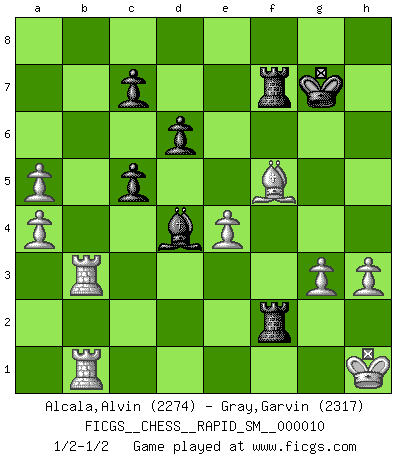 Last move : 1/2-1/2 2013 September 28 17:29:42 [Event "FICGS__CHESS__RAPID_SM__000010"] [Site "FICGS"] [Date "2013.05.27"] [Round "1"] [White "Alcala,Alvin"] [Black "Gray,Garvin"] [Result "1/2-1/2"] [WhiteElo "2274"] [BlackElo "2317"] 1.c4 Nf6 2.Nc3 g6 3.e4 d6 4.d4 Bg7 5.f3 O-O 6.Be3 a6 7.Qd2 Nbd7 8.Rd1 e5 9.Nh3 exd4 10.Bxd4 b6 11.Be2 Nc5 12.Nf2 Ne6 13.Be3 Re8 14.O-O Bb7 15.Rfe1 h5 16.Bf1 a5 17.b3 Nd7 18.Nd5 Qc8 19.f4 Nf6 20.f5 Nc5 21.Bxc5 bxc5 22.fxg6 fxg6 23.Nxf6+ Bxf6 24.Qh6 Qd7 25.Qxg6+ Qg7 26.Qxh5 Bd4 27.Rd3 Re5 28.Qd1 Re6 29.Be2 Rf8 30.Bf3 Rh6 31.Qd2 a4 32.bxa4 Rg6 33.g3 Kh8 34.Kg2 Bc8 35.Rf1 Rgf6 36.h3 Rh6 37.Rh1 Rh7 38.Ng4 Qf7 39.a5 Qxc4 40.Rb1 Bd7 41.Rdb3 Qf7 42.Qe2 Bxg4 43.Bxg4 Qf2+ 44.Qxf2 Rxf2+ 45.Kh1 Rhf7 46.Bf5 Kg7 47.a4 1/2-1/2 English Opening Kingside Castling by player Black (move 5) Kingside Castling by player White (move 14) This chess game ended in a draw. Follow this game move after move (download)If I win a tournament, I win it by myself. I do the playing. Nobody helps me. (Bobby Fischer) Ich brauche nur einen Blick auf das Schachbrett zu werfen, und weiß schon, was in der Stellung steckt, was geschehen kann und was geschehen wird. Alle übrigen suchen und prüfen, ich aber weiß es! (José Raúl Capablanca) En manos de Fischer's, una diminuta ventaja teórica es tan buena como tener una Reina de ventaja. (Isaac Kashdan) A ce moment-là, je menaçais de comprendre la position ! (Clément L'Heureux) Now the reason the enlightened prince and the wise general conquer the enemy whenever they move and their achievements surpass those of ordinary men is foreknowledge. (Sun Tzu)