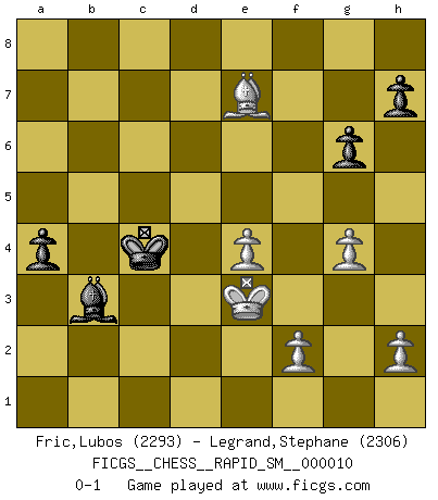Last move : 0-1 2013 November 2 2:56:49 [Event "FICGS__CHESS__RAPID_SM__000010"] [Site "FICGS"] [Date "2013.05.27"] [Round "1"] [White "Fric,Lubos"] [Black "Legrand,Stephane"] [Result "0-1"] [WhiteElo "2293"] [BlackElo "2306"] 1.d4 e6 2.c4 Nf6 3.Nf3 d5 4.g3 Be7 5.Bg2 O-O 6.O-O dxc4 7.Ne5 Nc6 8.Bxc6 bxc6 9.Nxc6 Qe8 10.Nxe7+ Qxe7 11.Qa4 e5 12.dxe5 Qxe5 13.Nc3 Ne4 14.Qxc4 Nxc3 15.bxc3 Be6 16.Qd3 Rad8 17.Bf4 Qh5 18.Qe3 Rfe8 19.Rfd1 Rxd1+ 20.Rxd1 f6 21.Bxc7 Bc4 22.Qxe8+ Qxe8 23.Rd8 Qxd8 24.Bxd8 Bxa2 25.e4 Kf7 26.Kg2 Ke6 27.g4 Bb3 28.Kg3 Kd7 29.Ba5 Kc6 30.Bb4 Kb5 31.Bf8 g6 32.Be7 a5 33.Bxf6 Kc4 34.Kf4 a4 35.Be7 Kxc3 36.Ke3 Kc4 0-1 Queen's pawn Kingside Castling by player Black (move 5) Kingside Castling by player White (move 6) Player Black won this chess game. Follow this game move after move (download)In a gambit you give up a Pawn for the sake of getting a lost game. (Samuel Standige Boden) Ich trinke, ich rauche, ich spiele, ich liebe Frauen aber Fernschach ist ein Laster, das ich nicht habe. (Mikhail Nekhemyevich Tal) Cuando tengas duda... ¡juega al Ajedrez!. (Tevis) Demandez au pauvre Cg1 ce qu'il en pense. Eduard Gufeld à propos de la variante Saemisch de l'Est-Indienne. Cactus - It is depressed cucumber. (Ilmars Cirulis)