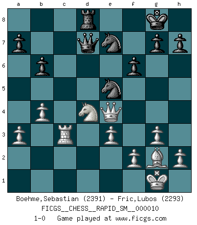 Last move : 1-0 2013 October 10 22:55:57 [Event "FICGS__CHESS__RAPID_SM__000010"] [Site "FICGS"] [Date "2013.05.27"] [Round "1"] [White "Boehme,Sebastian"] [Black "Fric,Lubos"] [Result "1-0"] [WhiteElo "2391"] [BlackElo "2293"] 1.d4 Nf6 2.c4 e6 3.Nf3 d5 4.g3 dxc4 5.Bg2 Nc6 6.Qa4 Bb4+ 7.Bd2 Nd5 8.Bxb4 Ndxb4 9.O-O Rb8 10.Na3 O-O 11.Qb5 b6 12.Qxc4 Qe7 13.Qc3 Ba6 14.Nc4 Nd5 15.Qc1 Qb4 16.b3 Rfd8 17.e3 Nce7 18.Qc2 c5 19.Rfc1 cxd4 20.Nxd4 Rbc8 21.a3 Qc5 22.Qb2 Bxc4 23.Rxc4 Qd6 24.Rac1 Rxc4 25.Rxc4 e5 26.Nf3 Rf8 27.Nxe5 Rd8 28.Qd4 f6 29.Nf3 Nc6 30.Qe4 Nde7 31.Nd4 Ne5 32.Rc3 Qd7 33.b4 1-0 Queen's pawn game Kingside Castling by player White (move 9) Kingside Castling by player Black (move 10) Player White won this chess game. Follow this game move after move (download)Play the opening like a book, the middle game like a magician, and the endgame like a machine. (Spielmann) Die Fehler sind da, Sie warten nur darauf gemacht zu werden. (Savielly Grigorievitsch Tartakower) Yo he agregado estos principios a la ley: pongan los Caballos en acción antes de que los dos Alfiles sean desarrollados. (Emanuel Lasker) RxDa4 pat (...) There are two types of people in this world, good and bad. The good sleep better, but the bad seem to enjoy the waking hours much more. (Woody Allen)