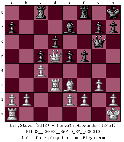 Last move : 1-0 2013 July 25 11:3:20 [Event "FICGS__CHESS__RAPID_SM__000010"] [Site "FICGS"] [Date "2013.05.27"] [Round "1"] [White "Lim,Steve"] [Black "Horvath,Alexander"] [Result "1-0"] [WhiteElo "2312"] [BlackElo "2451"] 1.d4 Nf6 2.c4 e6 3.Nf3 b6 4.g3 Bb7 5.Bg2 Be7 6.O-O O-O 7.Nc3 Ne4 8.Qc2 Nxc3 9.Qxc3 c5 10.Bf4 cxd4 11.Qxd4 d6 12.Qd3 Na6 13.Rfd1 Nc5 14.Qc2 Be4 15.Qd2 e5 16.Bg5 f6 17.Be3 Rc8 18.Ne1 Bxg2 19.Kxg2 f5 20.Qd5+ Kh8 21.Nd3 Qe8 22.Nxc5 bxc5 23.Rd3 Qg6 24.Kh1 1-0 Queen's Indian : Old Main line, 7.Nc3 Kingside Castling by player White (move 6) Kingside Castling by player Black (move 6) Player White won this chess game. Follow this game move after move (download)Bobby is the most misunderstood, misquoted celebrity walking the face of this earth. (Yasser Seirawan) Zeige mir drei Eröffnungsvarianten und ich beweise dir, dass zwei davon inkorrekt sind. (Emanuel Lasker) Solo existe una cosa que Fischer hace en el Ajedrez sin placer: ¡perder!. (Boris Spassky) La vie et les Echecs sont tous les deux une lutte constante. (Lasker) Perseverance does not equal worthiness. Next time you want to get my attention, wear something fun. Low-riding jeans are hot. (Gregory House, House M.D.)