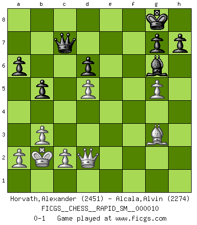 Last move : 0-1 2013 July 25 12:0:55 [Event "FICGS__CHESS__RAPID_SM__000010"] [Site "FICGS"] [Date "2013.05.27"] [Round "1"] [White "Horvath,Alexander"] [Black "Alcala,Alvin"] [Result "0-1"] [WhiteElo "2451"] [BlackElo "2274"] 1.e4 c5 2.Nf3 d6 3.d4 cxd4 4.Nxd4 Nf6 5.Nc3 a6 6.Be3 e5 7.Nb3 Be7 8.f3 Be6 9.Qd2 O-O 10.O-O-O Nbd7 11.g4 b5 12.g5 Nh5 13.Kb1 Nb6 14.Nd5 Nxd5 15.exd5 Bf5 16.Na5 f6 17.h4 Ng3 18.Nc6 Qd7 19.Rg1 Nxf1 20.Rdxf1 fxg5 21.hxg5 Bg6 22.Rf2 Rf5 23.b3 Raf8 24.Rgf1 Bd8 25.Kb2 Re8 26.f4 exf4 27.Bxf4 Ref8 28.Be3 Rxf2 29.Rxf2 Rxf2 30.Bxf2 Be7 31.Nxe7+ Qxe7 32.Bg3 Qc7 0-1 Garvin Gray Has this game timed out? Alvin Alcala He resigned! Sicilian : Najdorf, Byrne (English) attack Kingside Castling by player Black (move 9) Queenside Castling by player White (move 10) Player Black won this chess game. Follow this game move after move (download)I thought the most common mistake [in chess] was the first one: Learning the game :P (Garvin Gray, FICGS forum) Schach ist ein Teil der Kultur, und wenn es mit der Kultur abwärts geht, geht es auch mit dem Schach abwärts. (Mikhail Moiseyevich Botvinik) Aún el Rey más flojo huye despavorido ante la amenaza de un Jaque doble. (Aaron Nimzowitsch) Les échecs, c'est l'imagination. (David Bronstein) Computer Science is no more about computers than astronomy is about telescopes. (Edsger W. Dijkstra)