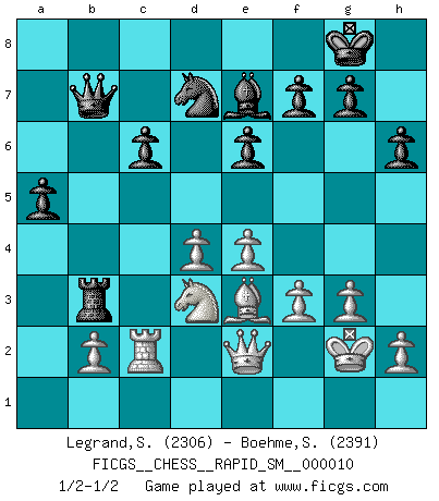 Last move : 1/2-1/2 2013 October 26 15:57:44 [Event "FICGS__CHESS__RAPID_SM__000010"] [Site "FICGS"] [Date "2013.05.27"] [Round "1"] [White "Legrand,Stephane"] [Black "Boehme,Sebastian"] [Result "1/2-1/2"] [WhiteElo "2306"] [BlackElo "2391"] 1.d4 Nf6 2.c4 e6 3.g3 d5 4.Nf3 Be7 5.Bg2 O-O 6.O-O dxc4 7.Qc2 a6 8.a4 Bd7 9.Rd1 Bc6 10.Nc3 Bxf3 11.Bxf3 Nc6 12.Bxc6 bxc6 13.a5 Rb8 14.Ra4 Rb4 15.Na2 Rxa4 16.Qxa4 Qd5 17.Nc3 Qh5 18.Qxc6 Qxa5 19.Qxc4 Rb8 20.e4 Rb4 21.Qe2 h6 22.Be3 c6 23.Kg2 Qb6 24.Rd2 Qb7 25.f3 Rb3 26.Rc2 Nd7 27.Na2 a5 28.Nc1 Rb4 29.Nd3 Rb3 30.Nc1 Rb4 31.Nd3 Rb3 1/2-1/2 Catalan Opening Kingside Castling by player Black (move 5) Kingside Castling by player White (move 6) This chess game ended in a draw. Follow this game move after move (download)By the beauty of his games, the clarity of his play, and the brilliance of his ideas, Fischer made himself an artist of the same stature as Brahms, Rembrandt, and Shakespeare. (David Levy) Stelle das Brett so, daß die Sonne in die Augen deines Gegners scheint. (Ruy López) La batalla por la última verdad nunca sera ganada. Y es por eso que el Ajedrez es tan fascinante. (Hans Kmoch) En blitz, le Cavalier l'emporte sur le Fou. (Vlastimil Hort) History is the quarrels of popes and kings, with wars or pestilences in every page; the men all so good for nothing, and hardly any women at all. (Jane Austen)