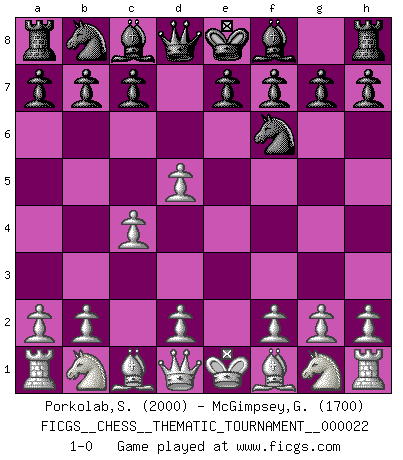 Last move : 1-0 2007 March 13 1:29:8 [Event "FICGS__CHESS__THEMATIC_TOURNAMENT__000022"] [Site "FICGS"] [Date "2007.01.31"] [Round "1"] [White "Porkolab,Sandor"] [Black "McGimpsey,Gordon"] [Result "1-0"] [WhiteElo "2000"] [BlackElo "1700"] 1.e4 d5 2.exd5 Nf6 3.c4 1-0 This chess game has been lost on time (started : 2007.01.31 12:49:19) Scandinavian defense Player White won this chess game. Follow this game move after move (download)No other master has such a terrific will to win. At the board he radiates danger, and even the strongest opponents tend to freeze, like rabbits when they smell a panther. Even his weaknesses are dangerous. As white, his opening game is predictable - you can make plans against it - but so strong that your plans almost never work. In the middle game his precision and invention are fabulous, and in the end game you simply cannot beat him. (Anonymous German Expert) Wir irren allesamt, nur jeder irrt anders. (Georg Christoph Lichtenberg) Prefiero perder una partida realmente buena, que ganar una mala. (David Levy) Vous savez, camarade Pachman, je n'éprouve pas de plaisir à être ministre, je jouerais plutôt aux échecs comme vous, ou alors ferais une révolution au Venezuela. (Che Guevara à Ludek Pachman, 'Checkmate in Prague', 1975) To send light into the darkness of men's hearts - such is the duty of the artist. (Schumann)