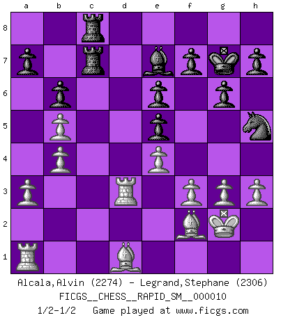 Last move : 1/2-1/2 2013 September 27 23:53:27 [Event "FICGS__CHESS__RAPID_SM__000010"] [Site "FICGS"] [Date "2013.05.27"] [Round "1"] [White "Alcala,Alvin"] [Black "Legrand,Stephane"] [Result "1/2-1/2"] [WhiteElo "2274"] [BlackElo "2306"] 1.c4 c5 2.Nf3 Nc6 3.d4 cxd4 4.Nxd4 Nf6 5.Nc3 e6 6.a3 Be7 7.e4 O-O 8.Nf3 Qc7 9.Bd3 b6 10.O-O Bb7 11.h3 d6 12.Be3 Ne5 13.Nxe5 dxe5 14.b4 Rfd8 15.Qc2 Rd7 16.Rfd1 Rad8 17.Nb5 Qb8 18.f3 Nh5 19.Bf2 Ba6 20.g3 Bxb5 21.cxb5 Qc8 22.Qxc8 Rxc8 23.Be2 Rdc7 24.Kg2 g6 25.Rd3 Kg7 26.Bd1 1/2-1/2 English : Symmetrical variation Kingside Castling by player Black (move 7) Kingside Castling by player White (move 10) This chess game ended in a draw. Follow this game move after move (download)No one ever won a game by resigning. (Unknown) Der Schachmeister von Heute braucht Courage, einen Killerinstinkt, Ausdauer und Arroganz. (Larry Evans) Muchos jugadores de Ajedrez se sorprendían cuando después de la partida, Fischer explicaba con calma: 'Yo ya había analizado esta posibilidad' en una posición en la cual yo creía que no era posible de prever desde la apertura. (Mikhail Tal) Soyez une menace à chaque fois que vous vous asseyez pour jouer. (Ken Smith) Wisdom doesn't necessarily come with age. Sometimes age just shows up all by itself. (Tom Watson)