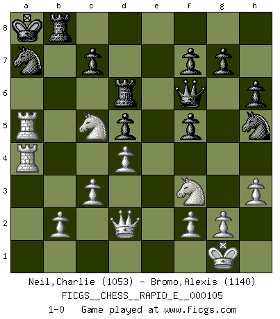 Last move : 1-0 2013 June 10 5:56:50 [Event "FICGS__CHESS__RAPID_E__000105"] [Site "FICGS"] [Date "2013.05.28"] [Round "1"] [White "Neil,Charlie"] [Black "Bromo,Alexis"] [Result "1-0"] [WhiteElo "1053"] [BlackElo "1140"] 1.d4 d5 2.Bf4 Nf6 3.e3 Nc6 4.Bb5 Bd7 5.h3 a6 6.Bd3 h6 7.Nf3 e6 8.c3 b5 9.Nbd2 Bd6 10.Nb3 Bxf4 11.exf4 Nh5 12.Qd2 Qf6 13.f5 exf5 14.O-O O-O-O 15.a4 bxa4 16.Bxa6+ Kb8 17.Rxa4 Na7 18.Rb4+ Ka8 19.Nc5 Bc8 20.Ra1 Bxa6 21.Rxa6 Rd6 22.Ra5 Rb8 23.Rba4 1-0 Queen's pawn, Mason variation Kingside Castling by player White (move 14) Queenside Castling by player Black (move 14) Player White won this chess game. Follow this game move after move (download)There is no remorse like the remorse of Chess. (H. G. Wells) Ich verstehe Aljechins Kombinationen ganz gut; aber woher er diese Angriffschancen bekommt und wie er die Eröffnung behandelt das ist für mich ein Buch mit sieben Siegeln. (Rudolf Spielmann) El ganar no lo es todo... pero el perder es nada. (Mednis) Le pion, dans sa simplicité, marche droit devant lui, mais lorsqu'il prend, il le fait obliquement? Ainsi l'homme, tant qu'il reste pauvre, marche dans la droiture et vit honnêtement, mais lorsqu'il recherche les honneurs, il flatte, se parjure et, par les voies obliques, cherche une position supérieure sur l'échiquier du monde. (Jean de Galles) You know what they say : You lie down with the Devil, you wake up in Hell. (Horatio Caine, C.S.I. Miami)