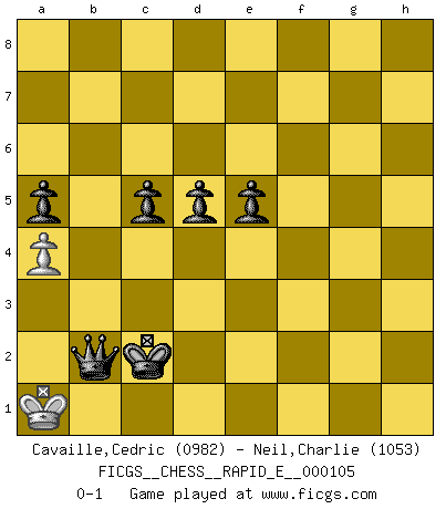 Last move : 0-1 2013 June 20 0:12:20 [Event "FICGS__CHESS__RAPID_E__000105"] [Site "FICGS"] [Date "2013.05.28"] [Round "1"] [White "Cavaille,Cedric"] [Black "Neil,Charlie"] [Result "0-1"] [WhiteElo "0982"] [BlackElo "1053"] 1.e4 e6 2.d4 d5 3.e5 c5 4.Bb5+ Bd7 5.Bxd7+ Nxd7 6.Nf3 Ne7 7.Nc3 Nc6 8.a3 cxd4 9.Nxd4 Bc5 10.Nxc6 bxc6 11.f4 Qb6 12.Qe2 O-O 13.Rf1 Rfd8 14.Na4 Qa5+ 15.b4 Qxa4 16.bxc5 Nxc5 17.Bd2 Ne4 18.g4 c5 19.f5 Qxc2 20.g5 Nxd2 21.Qxd2 Qxd2+ 22.Kxd2 Rab8 23.h4 Rb2+ 24.Kc3 R2b8 25.f6 gxf6 26.exf6 Rb6 27.Rfb1 Rdb8 28.Rxb6 Rxb6 29.a4 a5 30.Ra2 Rb4 31.h5 Re4 32.Rb2 Rb4 33.g6 hxg6 34.hxg6 fxg6 35.Rf2 Kf7 36.Rb2 Rxb2 37.Kxb2 Kxf6 38.Kc3 Ke5 39.Kd3 Kf4 40.Kd2 Kf3 41.Kd3 Kf2 42.Kd2 g5 43.Kd3 g4 44.Kd2 g3 45.Kd3 g2 46.Kd2 e5 47.Kc3 g1Q 48.Kb2 Ke3 49.Kc3 Qc1+ 50.Kb3 Kd3 51.Ka2 Qc4+ 52.Kb2 Qb4+ 53.Ka2 Kc2 54.Ka1 Qb2+ 0-1 French : Advance variation Kingside Castling by player Black (move 12) 10 pieces endgame at move 36 : White KPP , Black KRPPPPP WHITE : King + 2 Pawns BLACK : King + 1 Rook 5 Pawns 9 pieces endgame at move 37 : White KPP , Black KPPPPP WHITE : King + 2 Pawns BLACK : King + 5 Pawns 8 pieces endgame at move 37 : White KP , Black KPPPPP WHITE : King + 1 Pawn BLACK : King + 5 Pawns Promotion Queen by player Black (move 47) Player Black won this chess game. Follow this game move after move (download)In life, as in Chess, one's own Pawns block one's way. A man's very wealth, ease, leisure, children, books, which should help him to win, more often checkmate him. (Charles Buxton) Jeder weiß, dass Gasprom Putins persönliches Machtinstrument ist. Die Firma wird vom Kreml aus geleitet und wird schon deshalb nie transparent sein. (Garry Kasparov) Aquel que ve no otra dirección en el juego que la de dar Jaque Mate a su oponente, nunca será un buen jugador de Ajedrez. (Euwe) On croit qu'il y a plus de mauvais joueurs que de bons joueurs, c'est faux : Il y a autant de joueurs qui gagnent que de joueurs qui perdent. (Philippe Geluck) Pretend inferiority and encourage his arrogance. (Sun Tzu)