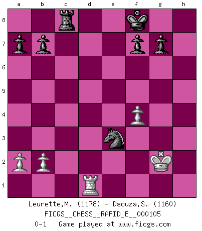 Last move : 0-1 2013 August 12 22:11:12 [Event "FICGS__CHESS__RAPID_E__000105"] [Site "FICGS"] [Date "2013.05.28"] [Round "1"] [White "Leurette,Marc-Antoine"] [Black "Dsouza,Stanislaus"] [Result "0-1"] [WhiteElo "1178"] [BlackElo "1160"] 1.e4 c5 2.Nf3 e6 3.d4 cxd4 4.Nxd4 d5 5.exd5 exd5 6.Bb5+ Bd7 7.Bxd7+ Nxd7 8.Nc3 Nb6 9.Qe2+ Be7 10.O-O Nf6 11.Nf5 d4 12.Nxe7 Qxe7 13.Bg5 h6 14.Qxe7+ Kxe7 15.Ne4 hxg5 16.Nxg5 Ng4 17.Rfe1+ Kf6 18.f4 Nd5 19.g3 Nde3 20.Re2 Rac8 21.Ne4+ Ke7 22.c3 dxc3 23.Nxc3 Kf8 24.h3 Rxh3 25.Nd1 Nxd1 26.Rxd1 Rxg3+ 27.Rg2 Rxg2+ 28.Kxg2 Ne3+ 0-1 Sicilian defense Kingside Castling by player White (move 10) Player Black won this chess game. Follow this game move after move (download)If your opponent offers you a draw, try to work out why he thinks he's worse off. (Nigel Short) Wie, soll nun auch die Opposition abgeschafft werden? Ja, es tut mir leid, Ihnen diesen Schmerz nicht ersparen zu können. (Aaron Nimzowitsch) Me siento como si fuera una pieza en una partida de Ajedrez, cuando mi oponente me indica: esa pieza no puede ser movida. (Soren Kierkegaard) J'ai vu le vaincu d'Echecs jouer des années durant dans l'espoir de la fête de la victoire. Car tu es plus riche de ce qu'elle existe si même elle n'est point pour toi. Ainsi de la perle du fond des mers. (Antoine de Saint-Exupéry) In God we trust, all others we virus scan. (Anonymous)