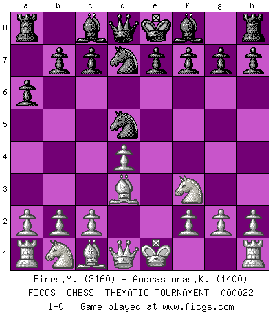 Last move : 1-0 2007 April 4 21:47:37 [Event "FICGS__CHESS__THEMATIC_TOURNAMENT__000022"] [Site "FICGS"] [Date "2007.01.31"] [Round "1"] [White "Pires,Miguel"] [Black "Andrasiunas,Kestutis"] [Result "1-0"] [WhiteElo "2160"] [BlackElo "1400"] 1.e4 d5 2.exd5 Nf6 3.Bb5+ Nbd7 4.d4 a6 5.Bd3 Nxd5 6.Nf3 1-0 This chess game has been lost on time (started : 2007.01.31 12:49:19) Scandinavian defense Player White won this chess game. Follow this game move after move (download)Chess is a fairy tale of 1001 blunders. (Savielly Tartakower) Wenn sie aufgeben, dann danke ich Ihnen für das Spiel (Eventualzug beim Fernschach). (Anonymous) Debemos de asegurarnos de que el Ajedrez no se convierta en un lenguaje muerto, muy interesante, pero tan solo para un grupo muy pequeño. (Sytze Faber) Mais n'est-ce pas déjà le limiter injurieusement que d'appeler les échecs un jeu? N'est-ce pas aussi une science, un art, ou quelque chose qui, comme le cercueil de Mahomet entre ciel et terre, est suspendu entre l'un et l'autre, et qui réunit un nombre incroyable de contraires ? (Stefan Zweig) A computer lets you make more mistakes faster than any invention in human history - with the possible exceptions of handguns and tequila. (Mitch Ratcliffe)