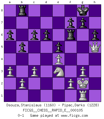 Last move : 0-1 2013 July 30 4:25:30 [Event "FICGS__CHESS__RAPID_E__000105"] [Site "FICGS"] [Date "2013.05.28"] [Round "1"] [White "Dsouza,Stanislaus"] [Black "Pipac,Darko"] [Result "0-1"] [WhiteElo "1160"] [BlackElo "1228"] 1.e4 e5 2.Nf3 Nc6 3.Bc4 h6 4.d3 Bb4+ 5.Bd2 Nf6 6.Bxb4 Nxb4 7.a3 Nc6 8.O-O d6 9.Nc3 a6 10.Nd5 O-O 11.Nxf6+ Qxf6 12.h3 Be6 13.c3 Qg6 14.Nh4 Qg5 15.g3 Bxh3 16.Re1 Bg4 17.Qc2 Rfe8 18.Re3 Be6 19.Kh2 Bxc4 20.dxc4 Re6 21.Rg1 Rf6 22.Qe2 Rb8 23.Nf3 Qh5+ 24.Kg2 Na5 25.Nh2 b5 26.Qxh5 Nxc4 27.Ng4 Nxe3+ 28.Nxe3 c6 0-1 This chess game has been lost on time (started : 2013.05.28 9:36:5) King's pawn game Kingside Castling by player White (move 8) Kingside Castling by player Black (move 10) Player Black won this chess game. Follow this game move after move (download)I had a toothache during the first game. In the second game I had a headache. In the third game it was an attack of rheumatism. In the fourth game, I wasn't feeling well. And in the fifth game? Well, must one have to win every game ? (Siegbert Tarrasch) Über Karpov: Er war und ist ein Vertreter der russischen Reaktionäre. Das steckt tief in seiner Seele, wehalb ich nicht nett mit ihm umgehen kann. (Viktor Kortschnoi) ¿Se han dado cuenta de que Fischer casi nunca ha tenido piezas malas? El las intercambia y las piezas malas se quedan con sus oponenets. (Yuri Balashov) Horreur, mais aussi harmonie suprême : qu'y avait-il en effet au monde en dehors des échecs ? Le brouillard, l'inconnu, le non-être... (Vladimir Nabokov) Those who make the worst use of their time are the first to complain of its brevity. (Jean de la Bruyere)