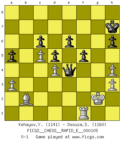 Last move : 0-1 2013 September 12 3:28:26 [Event "FICGS__CHESS__RAPID_E__000105"] [Site "FICGS"] [Date "2013.05.28"] [Round "1"] [White "Kehayov,Yulian"] [Black "Dsouza,Stanislaus"] [Result "0-1"] [WhiteElo "1141"] [BlackElo "1160"] 1.d4 f5 2.f4 d5 3.e3 Nf6 4.Nf3 e6 5.Be2 Bd6 6.O-O Nc6 7.c4 O-O 8.c5 Be7 9.Nc3 Re8 10.Bd3 Nb4 11.a3 Nxd3 12.Qxd3 a6 13.b4 Bd7 14.Ne5 Ne4 15.Qe2 Nxc3 16.Qc2 Ne4 17.Nd3 c6 18.Nf2 Nxf2 19.Qxf2 Bf6 20.Bb2 b6 21.Bc3 Qc7 22.Rad1 bxc5 23.h3 h6 24.Bb2 Kh7 25.bxc5 g5 26.Rfe1 Rg8 27.g3 a5 28.Rd2 Be8 29.Red1 gxf4 30.exf4 Bh4 31.Rd3 Bh5 32.R1d2 Rg6 33.Kh2 Rag8 34.Qe1 Qd7 35.gxh4 Qg7 36.Qf1 Rg1 37.Qf2 Qc7 38.Rd1 R1g2+ 39.Qxg2 Rxg2+ 40.Kxg2 Bxd1 41.Rxd1 Qxf4 42.Rf1 Qe4+ 0-1 Dutch Kingside Castling by player White (move 6) Kingside Castling by player Black (move 7) Player Black won this chess game. Follow this game move after move (download)Fischer is under obligation to nobody. (Joseph Platz) Man gibt nur Pakete auf. (Paul Keres) Una buena ofensiva y una buena defensa, comienzan ambas con un buen desarrollo. (Bruce A. Moon) Mon pion favori sur ma case favorite ! Bronstein en parlant d'un coup de pion en h5 quand il avait les Noirs. Ah, the Socrating method. The best way we have of teaching everything-apart from juggling chainsaws. (Gregory House, House M.D.)