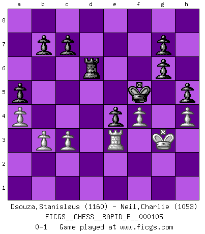 Last move : 0-1 2013 August 18 18:25:2 [Event "FICGS__CHESS__RAPID_E__000105"] [Site "FICGS"] [Date "2013.05.28"] [Round "1"] [White "Dsouza,Stanislaus"] [Black "Neil,Charlie"] [Result "0-1"] [WhiteElo "1160"] [BlackElo "1053"] 1.e4 e5 2.Nf3 Nc6 3.Bc4 Bc5 4.d3 Nf6 5.Be3 Bxe3 6.fxe3 O-O 7.O-O d5 8.exd5 Nxd5 9.Nc3 Nxe3 10.Qe2 Nxc4 11.dxc4 Bg4 12.h3 Bh5 13.Rad1 Qe7 14.Nd5 Qc5+ 15.Kh2 Nd4 16.Qd2 Nxf3+ 17.gxf3 Rad8 18.Qg5 Bg6 19.h4 Qxc4 20.Ne7+ Kh8 21.Nxg6+ fxg6 22.Rxd8 Qe2+ 23.Qg2 Qxg2+ 24.Kxg2 Rxd8 25.Rf2 Kg8 26.Kg3 Kf7 27.Kg4 Kf6 28.Kg3 h5 29.f4 e4 30.Re2 Re8 31.b3 Kf5 32.Re3 Re6 33.c3 Rd6 34.a4 a5 0-1 This chess game has been lost on time (started : 2013.05.28 9:36:5) Giuoco Pianissimo Kingside Castling by player Black (move 6) Kingside Castling by player White (move 7) Player Black won this chess game. Follow this game move after move (download)Excellence at Chess is one mark of a scheming mind. (Sir Arthur Conan Doyle) Das Schachspiel hat wie die Liebe, die Musik, die Fähigkeit, den Menschen glücklich zu machen. Ich habe ein leises Gefühl des Bedauerns für jeden, der das Schachspiel nicht kennt, so wie ich jeden bedaure, der die Liebe nicht kennt. (Siegbert Tarrasch) Si un gobernante no entiende al Ajedrez, ¿como puede governar él un reinado?. (El Rey Khusros II) L'attaque fait le spectacle, la défense gagne les matchs. (Dicton footballistique) Always be a first-rate version of yourself, instead of a second-rate version of somebody else. (Judy Garland)