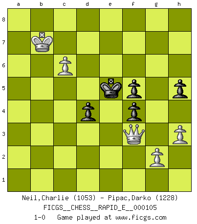 Last move : 1-0 2013 June 26 23:14:41 [Event "FICGS__CHESS__RAPID_E__000105"] [Site "FICGS"] [Date "2013.05.28"] [Round "1"] [White "Neil,Charlie"] [Black "Pipac,Darko"] [Result "1-0"] [WhiteElo "1053"] [BlackElo "1228"] 1.e4 e5 2.Nf3 Nc6 3.Bb5 d6 4.c3 Bg4 5.h3 Bh5 6.d4 exd4 7.cxd4 a6 8.Ba4 Bxf3 9.Bxc6+ bxc6 10.Qxf3 Rb8 11.Nc3 Nf6 12.Bg5 h6 13.Bc1 d5 14.e5 Ne4 15.Nxe4 dxe4 16.Qxe4 Bb4+ 17.Bd2 Bxd2+ 18.Kxd2 Qd5 19.Qxd5 cxd5 20.b3 O-O 21.Rac1 Rb7 22.Rhe1 Rc8 23.Re3 c6 24.Rc5 Rb5 25.Rec3 Rxc5 26.Rxc5 Kf8 27.Kc3 Ke7 28.Kb4 Rb8+ 29.Ka5 Rb5+ 30.Rxb5 axb5 31.a4 bxa4 32.bxa4 Kd7 33.Kb6 f5 34.f4 g5 35.a5 gxf4 36.Kb7 h5 37.a6 c5 38.dxc5 Ke6 39.a7 Kxe5 40.a8Q Ke4 41.Qa3 d4 42.Qf3+ Ke5 43.c6 1-0 Ruy Lopez : Old Steinitz defense Kingside Castling by player Black (move 20) 10 pieces endgame at move 39 : White KPPPP , Black KPPPP WHITE : King + 4 Pawns BLACK : King + 4 Pawns Promotion Queen by player White (move 40) Player White won this chess game. Follow this game move after move (download)Human affairs are like a Chess game: only those who do not take it seriously can be called good players. (Hung Tzu Ch'eng) Kombinieren und Schwarzhandel gehören verboten. (Savielly Grigorievitsch Tartakower) ¡Examina movidas que hagan daño! Un buen ojo for movidas desvastantes es mucho mas importante que el conocimiento de principios estratégicos. (Purdy) La tactique est l'élément le plus important du milieu de jeu. (Siegbert Tarrasch) Kids, you tried your best and you failed miserably. The lesson is, never try. (Simpsons)