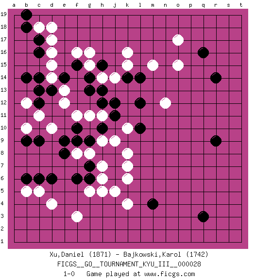 Last move : 1-0 2013 June 29 15:25:58 [Event "FICGS__GO__TOURNAMENT_KYU_III__000028"] [Site "FICGS"] [Date "2013.05.28"] [Round "1"] [Black "Xu,Daniel"] [White "Bajkowski,Karol"] [Result "1-0"] [Rating 1 "1871"] [Rating 2 "1742"] 1.q16 d4 2.q3 d16 3.r9 k4 4.m4 k16 5.c14 c11 6.c17 d17 7.c16 d15 8.b14 e13 9.c6 c5 10.d6 f3 11.c9 o17 12.r14 d10 13.f6 g5 14.g6 h5 15.e8 o15 16.h15 j14 17.g13 h14 18.g14 g15 19.f15 g16 20.e14 d14 21.d13 e12 22.c12 g11 23.h12 h11 24.j12 f16 25.j11 h9 26.l12 n12 27.k14 k15 28.l14 m15 29.j8 b10 30.b9 b12 31.c13 c18 32.b18 d18 33.b19 h7 34.h8 g8 35.g7 f8 36.e9 j9 37.f10 k8 38.j7 k10 39.h13 f11 40.l10 k7 41.j6 h6 42.g9 k6 43.f9 j5 44.h10 b5 45.b6 1-0 Here are the names of the openings (joseki) played in the four corners : Corner d16 : d16 c14 Hoshi (Hwajeom, Seongjeom, Xingwei`) 4-4 Point. The star or hoshi (4-4) point, emphasizing influence at the potential expense of territory. Ikken Kakari (Hankan Keolch'im, Yi Gua`jiao~, 1-Space Low Approach). Black 2 is the standard approach move to the 4-4. Corner d4 : d4 c6 Hoshi (Hwajeom, Seongjeom, Xingwei`) 4-4 Point. The star or hoshi (4-4) point, emphasizing influence at the potential expense of territory. Ikken Kakari (Hankan Keolch'im, Yi Gua`jiao~, 1-Space Low Approach). Black 2 is the standard approach move to the 4-4. Corner q16 : q16 o17 Hoshi (Hwajeom, Seongjeom, Xingwei`) 4-4 Point. The star or hoshi (4-4) point, emphasizing influence at the potential expense of territory. Ikken Kakari (Hankan Keolch'im, Yi Gua`jiao~, 1-Space Low Approach). White 2 is the standard approach move to the 4-4. Player Black won this Go (weiqi, baduk) game. Follow this game move after move (download)Don't make dango's. (Anonymous) Man with more than one clock never knows what time it is. (Chinese thought)