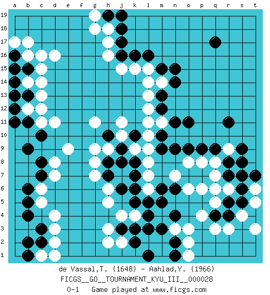 Last move : 0-1 2014 February 4 23:15:19 [Event "FICGS__GO__TOURNAMENT_KYU_III__000028"] [Site "FICGS"] [Date "2013.05.28"] [Round "1"] [Black "de Vassal,Thibault"] [White "Aahlad,Yeturu"] [Result "0-1"] [Rating 1 "1648"] [Rating 2 "1966"] 1.q4 d16 2.q17 d4 3.r11 o3 4.l3 r3 5.r4 q3 6.k16 h3 7.c10 p4 8.q6 o6 9.l5 l7 10.k6 h6 11.k7 l8 12.j8 g8 13.c7 q8 14.r8 r9 15.s8 q7 16.r7 h9 17.j9 j10 18.k10 k9 19.k8 l9 20.h10 j11 21.h8 g9 22.h7 g7 23.j6 h5 24.j3 j2 25.k2 j4 26.k3 g11 27.q9 k4 28.l4 h2 29.n2 o2 30.n1 c12 31.b4 c5 32.b5 c6 33.b6 d7 34.c8 h16 35.j17 h17 36.o11 l15 37.l16 k15 38.m15 m14 39.n15 p6 40.c3 d3 41.n14 c16 42.p9 q5 43.r5 r6 44.s6 d11 45.b11 l12 46.b13 b12 47.a12 n3 48.m3 o1 49.l1 c14 50.b15 b14 51.a14 b16 52.a16 a17 53.a15 c15 54.a13 c13 55.a11 b17 56.j18 h18 57.h19 g19 58.j19 g18 59.j16 c11 60.b9 j15 61.c2 l6 62.k5 d2 63.m13 l13 64.m12 m11 65.n11 s4 66.s5 t3 67.n9 e9 68.m10 l10 69.m5 c1 70.b1 d1 71.b2 q6 72.n4 t5 73.s9 t6 74.s7 d8 75.t7 l11 76.m9 o8 77.o9 p8 78.n6 n7 79.m6 l14 0-1 Here are the names of the openings (joseki) played in the four corners : Corner q4 : q4 o3 Hoshi (Hwajeom, Seongjeom, Xingwei`) 4-4 Point. The star or hoshi (4-4) point, emphasizing influence at the potential expense of territory. Ikken Kakari (Hankan Keolch'im, Yi Gua`jiao~, 1-Space Low Approach). White 2 is the standard approach move to the 4-4. Player White won this Go (weiqi, baduk) game. Follow this game move after move (download)Don't make empty triangles. (Anonymous) Just because you do not take an interest in politics doesn't mean politics won't take an interest in you. (Pericles 430 B.C.)