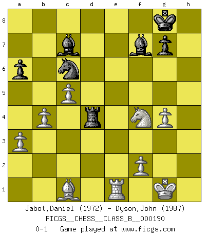 Last move : 0-1 2013 December 23 19:55:14 [Event "FICGS__CHESS__CLASS_B__000190"] [Site "FICGS"] [Date "2013.05.28"] [Round "1"] [White "Jabot,Daniel"] [Black "Dyson,John"] [Result "0-1"] [WhiteElo "1972"] [BlackElo "1987"] 1.e4 c6 2.Nf3 d5 3.exd5 cxd5 4.d4 Nc6 5.Bb5 Bg4 6.O-O e6 7.Nbd2 Bd6 8.Re1 Nge7 9.c4 O-O 10.c5 Bc7 11.h3 Bf5 12.a3 h6 13.b3 a6 14.Bf1 b6 15.b4 bxc5 16.dxc5 e5 17.Bb2 e4 18.Nd4 Nxd4 19.Bxd4 Nc6 20.Bb2 Qg5 21.g3 Be6 22.Bg2 Rad8 23.Qc2 f5 24.Nf3 Qg6 25.Qe2 f4 26.g4 h5 27.Nh4 Qh6 28.Bxe4 dxe4 29.Qxe4 Bd5 30.Qg6 Qxg6 31.Nxg6 Rf7 32.Rad1 hxg4 33.hxg4 Rfd7 34.Bc1 Bf7 35.Rxd7 Rxd7 36.Nxf4 Rd4 0-1 Caro-Kann defense Kingside Castling by player White (move 6) Kingside Castling by player Black (move 9) Player Black won this chess game. Follow this game move after move (download)The boy (then a 12 year old boy named Anatoly Karpov) doesn't have a clue about Chess, and there's no future at all for him in this profession. (Mikhail Botvinnik) Jeder Fehler erscheint unglaublich dumm, wenn andre ihn begehen. (Georg Christoph Lichtenberg) Al jugar al Ajedrez entonces, podemos aprender: Primero: Previsión... Segundo: Prudencia... Tercero: Cautela... Y al final, aprendemos del Ajedrez el hábito de no ser desanimados por apariencias malas presentes en el estado de nuestros asuntos, el hábito de la esperanza por una oportunidad favorable y la perseveración de los secretos de los recursos. (Benjamin Franklin) On n'a jamais que l'âge auquel on a commence à jouer aux échecs car après on cesse de vieillir. (Capablanca) Men should grow up. - Yeah. And dogs should stop licking themselves. It's not gonna happen. (Gregory House to Dr. Cameron, House M.D.)