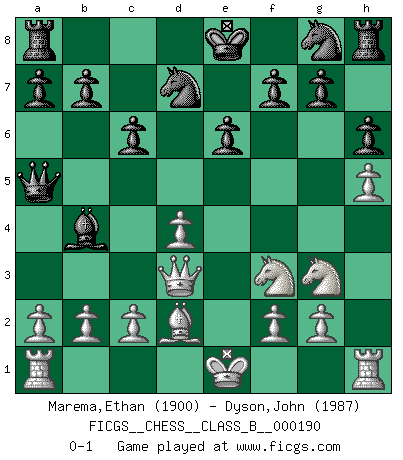 Last move : 0-1 2013 July 4 22:43:49 [Event "FICGS__CHESS__CLASS_B__000190"] [Site "FICGS"] [Date "2013.05.28"] [Round "1"] [White "Marema,Ethan"] [Black "Dyson,John"] [Result "0-1"] [WhiteElo "1900"] [BlackElo "1987"] 1.e4 c6 2.d4 d5 3.Nc3 dxe4 4.Nxe4 Bf5 5.Ng3 Bg6 6.Nf3 Nd7 7.h4 h6 8.h5 Bh7 9.Bd3 Bxd3 10.Qxd3 e6 11.Bf4 Qa5+ 12.Bd2 Bb4 0-1 Caro-Kann : Classical variation Player Black won this chess game. Follow this game move after move (download)Chess is so inspiring that I do not believe a good player is capable of having an evil thought during the game. (Wilhelm Steinitz) Kombinieren und Schwarzhandel gehören verboten. (Savielly Grigorievitsch Tartakower) Una compensación adecuada por un sacrificio es tener una combinación sólida que conduce a una posición ganadora; una compensación adecuada por una metida de pata es dejar a tu oponente arrebatar una derrota de las fauces de la victoria. (Bruce A. Moon) Karpov est une pièce de musée. (Garry Kasparov) There are two kinds of people in the world, my friend. Those who have a loaded gun and those who dig. You dig ! (Blondie in The Good, The Bad and The Ugly)