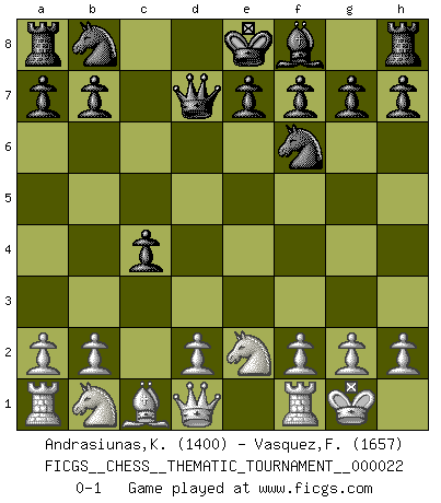 Last move : 0-1 2007 April 6 16:8:58 [Event "FICGS__CHESS__THEMATIC_TOURNAMENT__000022"] [Site "FICGS"] [Date "2007.01.31"] [Round "1"] [White "Andrasiunas,Kestutis"] [Black "Vasquez,Fernando"] [Result "0-1"] [WhiteElo "1400"] [BlackElo "1657"] 1.e4 d5 2.exd5 Nf6 3.Bb5+ Bd7 4.Bxd7+ Qxd7 5.c4 c6 6.Ne2 cxd5 7.O-O dxc4 0-1 This chess game has been lost on time (started : 2007.01.31 12:49:19) Scandinavian defense Kingside Castling by player White (move 7) Player Black won this chess game. Follow this game move after move (download)A big shock; the best chess player in history has passed away. (Lajos Portisch, about Bobby Fischer's death) Aljechin war kein Nazi. Er war ein Opportunist. Ein schrecklicher Mann. Er liebte Geld über alles und würde für Geld ein Jude, ein Katolik oder ein Protestant werden. (Miguel Najdorf) El Ajedrez es 99 por ciento táctica. (Teichmann) Pour se monter efficace, un Cavalier a besoin d'avant-postes ! Les Cavaliers font les meilleurs bloqueurs de pions passés. A good player is always lucky. (Capablanca)