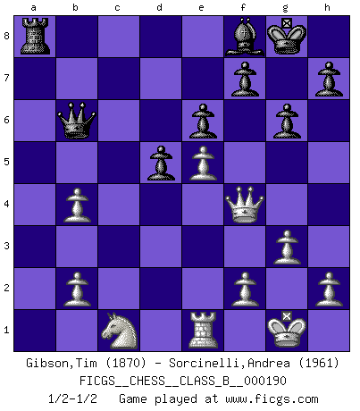 Last move : 1/2-1/2 2013 July 22 6:20:0 [Event "FICGS__CHESS__CLASS_B__000190"] [Site "FICGS"] [Date "2013.05.28"] [Round "1"] [White "Gibson,Tim"] [Black "Sorcinelli,Andrea"] [Result "1/2-1/2"] [WhiteElo "1870"] [BlackElo "1961"] 1.e4 c5 2.Nf3 d6 3.d4 cxd4 4.Bb5+ Bd7 5.Bxd7+ Qxd7 6.Qxd4 Nc6 7.Qd3 g6 8.Nc3 Bg7 9.O-O Nf6 10.Re1 Ng4 11.Bf4 Nge5 12.Bxe5 Nxe5 13.Nxe5 Bxe5 14.Rab1 O-O 15.Nd5 e6 16.Ne3 Rac8 17.c3 Rfd8 18.Rbd1 Bg7 19.a3 Qc6 20.Re2 b5 21.Nc2 d5 22.e5 a6 23.Nd4 Qb6 24.Nb3 a5 25.Qd4 Qc7 26.R2e1 Ra8 27.Qf4 Rdc8 28.g3 b4 29.cxb4 axb4 30.Rc1 Qb6 31.axb4 Rxc1 32.Nxc1 Bf8 1/2-1/2 Sicilian Kingside Castling by player White (move 9) Kingside Castling by player Black (move 14) This chess game ended in a draw. Follow this game move after move (download)Help your pieces so they can help you. (Paul Morphy) Wenn du auf das Glück wartest, wird das Leben ziemlich langweilig. (Mikhail Nekhemyevich Tal) Mi estilo es algo parecido entre un poco de Tal y Petrosian. (Reshevsky) Le plus grand jeu de l'esprit jamais inventé, plus vous l'apprenez, plus vous y prenez du plaisir. (Garry Kasparov) Thibault, I ask for draw. Game 13876. - Sorry Ilmars, you won. (FICGS chat)