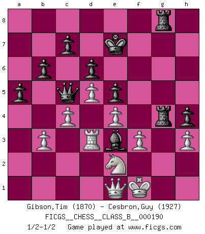 Last move : 1/2-1/2 2013 October 4 6:3:44 [Event "FICGS__CHESS__CLASS_B__000190"] [Site "FICGS"] [Date "2013.05.28"] [Round "1"] [White "Gibson,Tim"] [Black "Cesbron,Guy"] [Result "1/2-1/2"] [WhiteElo "1870"] [BlackElo "1927"] 1.e4 d6 2.d4 Nf6 3.Nc3 g6 4.Nf3 Bg7 5.Be2 O-O 6.O-O Bg4 7.h3 Bxf3 8.Bxf3 Nc6 9.Ne2 e5 10.d5 Ne7 11.c4 Nd7 12.Nc3 f5 13.Bg5 f4 14.Bg4 h6 15.Bxe7 Qxe7 16.Rb1 h5 17.Be6+ Kh7 18.Bxd7 Qxd7 19.Qf3 b6 20.a4 a5 21.Nb5 Bf6 22.Rbc1 Kg7 23.Rfd1 Rh8 24.Qc3 g5 25.Qd3 g4 26.Rc3 Rh6 27.Kh1 Rg6 28.Rg1 f3 29.gxf3 g3 30.Qf1 h4 31.Kg2 Bg5 32.Rd3 Rg8 33.Nc3 Kf8 34.Ne2 Qxa4 35.b3 gxf2 36.Kxf2 Qa3 37.Qb1 Qc5+ 38.Kf1 Ke7 39.Rg4 Be3 40.Qe1 Rxg4 1/2-1/2 Pirc : Classical system, 5.Be2 Kingside Castling by player Black (move 5) Kingside Castling by player White (move 6) This chess game ended in a draw. Follow this game move after move (download)The Chess pieces are the block alphabet which shapes thoughts; and these thoughts, although making a visual design on the chessboard, express their beauty abstractly, like a poem. (Marcel Duchamp) Ich war zu klein für die Schach-Schülermannschaft! (Woody Allen) Yo creo que el Ajedrez posee una magia que es también una ayuda en la edad avanzada. Una rodilla reumática es olvidada durante una partida de Ajedrez y otros eventos pueden parecer algo sin importancia comparada a una catástrofe en el tablero de Ajedrez. (Vlastimil Hort) Pour se monter efficace, un Cavalier a besoin d'avant-postes ! Les Cavaliers font les meilleurs bloqueurs de pions passés. There is no vagueness without wind. (Chinese proverb)