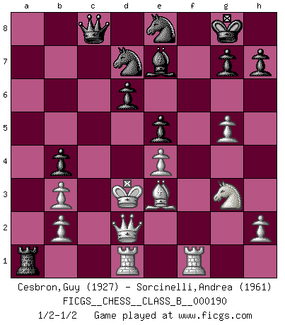 Last move : 1/2-1/2 2013 July 18 2:17:27 [Event "FICGS__CHESS__CLASS_B__000190"] [Site "FICGS"] [Date "2013.05.28"] [Round "1"] [White "Cesbron,Guy"] [Black "Sorcinelli,Andrea"] [Result "1/2-1/2"] [WhiteElo "1927"] [BlackElo "1961"] 1.e4 c5 2.Nf3 d6 3.d4 cxd4 4.Nxd4 Nf6 5.Nc3 a6 6.Be3 e5 7.Nb3 Be6 8.f3 Be7 9.Qd2 O-O 10.O-O-O Nbd7 11.g4 b5 12.g5 b4 13.Ne2 Ne8 14.f4 a5 15.f5 a4 16.fxe6 axb3 17.exf7+ Rxf7 18.cxb3 Rxa2 19.Ng3 Rxf1 20.Rhxf1 Ra1+ 21.Kc2 Qc8+ 22.Kd3 1/2-1/2 Sicilian : Najdorf, Byrne (English) attack Kingside Castling by player Black (move 9) Queenside Castling by player White (move 10) This chess game ended in a draw. Follow this game move after move (download)Only the player with the initiative has the right to attack. (Wilhelm Steinitz) Das Schachspiel übertrifft alle anderen Spiele so weit wie der Chimborasso einen Misthaufen. (Arthur Schopenhauer) Tu sabes que vas a perder. Aún cuando tenía la ventaja, yo sabía que iba a perder. - al estar jugando con Fischer (Andrew Soltis) Les Echecs ont trois composantes : le temps, l'espace et le matériel en dernier. (Mikhail Tal) It's not a bug - it's an undocumented feature. (Anonymous)