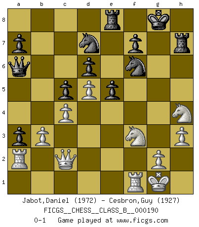 Last move : 0-1 2014 February 28 2:19:35 [Event "FICGS__CHESS__CLASS_B__000190"] [Site "FICGS"] [Date "2013.05.28"] [Round "1"] [White "Jabot,Daniel"] [Black "Cesbron,Guy"] [Result "0-1"] [WhiteElo "1972"] [BlackElo "1927"] 1.e4 d6 2.d4 Nf6 3.Nc3 g6 4.f4 Bg7 5.Nf3 c5 6.Bb5+ Bd7 7.Bxd7+ Nfxd7 8.d5 b5 9.Qe2 b4 10.Nd1 Nb6 11.O-O Qc8 12.f5 Qa6 13.Qe1 N8d7 14.fxg6 hxg6 15.Bf4 Kf8 16.a3 Kg8 17.Bg5 Re8 18.Qf2 Rh7 19.h3 Qa4 20.Bc1 Rh5 21.b3 Qa6 22.Bb2 Bxb2 23.Nxb2 bxa3 24.Nd3 Nf6 25.Nf4 Rh8 26.c4 Nxe4 27.Qc2 Nf6 28.Nxg6 Rh7 29.Ngh4 Nbd7 30.Ra2 e5 0-1 This chess game has been lost on time (started : 2013.05.28 21:37:29) Pirc : Austrian attack, Dragon formation Kingside Castling by player White (move 11) Player Black won this chess game. Follow this game move after move (download)A sacrifice is best refuted by accepting it. (Wilhelm Steinitz) Der Umstand, daß uns eine 7 Stunden Zeitkontrolle ermöglicht eine großartige, tiefe Partie zu spielen, ist für die Massenmedien nicht weiter von Bedeutung. (Alexej Shirov) Los errores estan ahí, esperando a que se cometan. (Savielly Tartakower) Ce qui est bien, c'est d'avoir tout un tas de pièces en prise : l'adversaire ne peut en prendre qu'une à la fois. Cité par Thierry Audin. Mandala - that's it! 16x16 squares as multiple of the four and the eight because of the Four Noble Truths and the Noble Eightfold Path. (Heinz-Georg Lehnhoff about Big Chess)