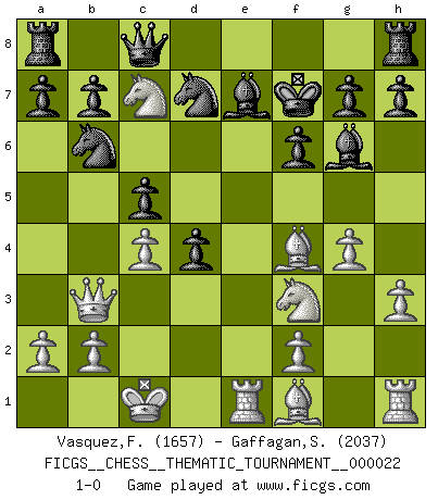 Last move : 1-0 2007 June 28 3:7:20 [Event "FICGS__CHESS__THEMATIC_TOURNAMENT__000022"] [Site "FICGS"] [Date "2007.01.31"] [Round "1"] [White "Vasquez,Fernando"] [Black "Gaffagan,Steven"] [Result "1-0"] [WhiteElo "1657"] [BlackElo "2037"] 1.e4 d5 2.exd5 Nf6 3.d4 Nxd5 4.Nf3 Bg4 5.h3 Bh5 6.c4 Nb6 7.Nc3 e6 8.g4 Bg6 9.Qb3 c5 10.Bg5 f6 11.Be3 N8d7 12.O-O-O Qc8 13.d5 exd5 14.Bf4 d4 15.Nb5 Kf7 16.Nc7 Be7 17.Re1 1-0 This chess game has been lost on time (started : 2007.01.31 12:49:19) Scandinavian : Marshall variation Queenside Castling by player White (move 12) Player White won this chess game. Follow this game move after move (download)If cunning alone were needed to excel, women would be the best Chess players. (Albin) Ich hatte Angst gegen einen russischen Großmeister zu verlieren, und er befürchtete gegen einen kleinen Jungen zu verlieren. (über ein Remis gegen Juri Awerbach). (Robert James Fischer) Solo existe una cosa que Fischer hace en el Ajedrez sin placer: ¡perder!. (Boris Spassky) La vie et les Echecs sont tous les deux une lutte constante. (Lasker) Information on the Internet is subject to the same rules and regulations as conversation at a bar. (George Lundberg)