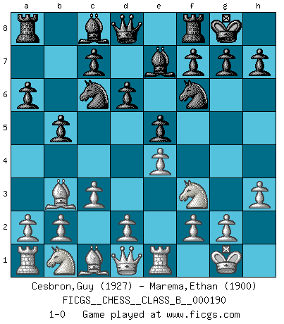 Last move : 1-0 2013 July 4 22:43:56 [Event "FICGS__CHESS__CLASS_B__000190"] [Site "FICGS"] [Date "2013.05.28"] [Round "1"] [White "Cesbron,Guy"] [Black "Marema,Ethan"] [Result "1-0"] [WhiteElo "1927"] [BlackElo "1900"] 1.e4 e5 2.Nf3 Nc6 3.Bb5 a6 4.Ba4 Nf6 5.O-O Be7 6.Re1 b5 7.Bb3 O-O 8.h3 d6 9.c3 1-0 Ruy Lopez : Closed, 7...O-O Kingside Castling by player White (move 5) Kingside Castling by player Black (move 7) Player White won this chess game. Follow this game move after move (download)If your opponent cannot do anything active, then don't rush the position; instead you should let him sit there, suffer, and beg you for a draw. (Jeremy Silman) Ich bin es gewohnt, das die Jugend mir überhaupt keinen Respekt entgegenbringt. (Alexander Morozewich) EL Ajedrez es como la vida. (Boris Spassky) J'ai toujours senti une vague pitié pour l'homme qui ne connaît rien aux échecs, tout comme j'en aurais pour un homme ignorant de l'amour. Les Echecs, comme la musique ou comme l'amour, ont le pouvoir de rendre heureux. (Siegbert Tarrasch) Cactus - It is depressed cucumber. (Ilmars Cirulis)