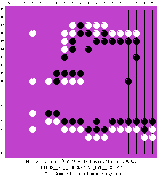 Last move : 1-0 2013 September 18 16:25:55 [Event "FICGS__GO__TOURNAMENT_KYU__000147"] [Site "FICGS"] [Date "2013.05.31"] [Round "1"] [Black "Medearis,John"] [White "Jankovic,Mladen"] [Result "1-0"] [Rating 1 "0697"] [Rating 2 "0000"] 1.r5 d4 2.r15 d16 3.k16 d10 4.q10 k4 5.n4 h16 6.j14 h15 7.j15 q16 8.q15 r16 9.r13 k10 10.h11 h10 11.j11 j10 12.k11 q4 13.q5 p4 14.p5 r4 15.s4 o4 16.o5 n3 17.m4 m3 18.l4 l3 19.m5 s3 20.s5 t4 21.t5 t3 22.k5 j4 23.j5 h4 24.h5 g5 25.g6 f5 26.f6 d6 27.g10 f10 28.g11 h14 29.h13 j16 30.l16 p16 31.p15 o16 32.n16 n17 33.o15 m16 34.n15 m17 35.m15 l17 36.k17 j17 37.l14 1-0 Here are the names of the openings (joseki) played in the four corners : Corner q16 : r15 q16 Mokuhazushi (Waemok, Wai`mu`) 5-3 Point. The mokuhazushi (5-3) point was popular in the Edo period in Japan (1600 - 1867). It emphasizes influence; territorially, it is inferior to the 3-4 point. Player Black won this Go (weiqi, baduk) game. Follow this game move after move (download)There are possible things, impossible things, and things that happen. Sometimes things happen that were impossible. (Pierre Audouard) Question: Is 'This statement is paradoxical' a paradoxical statement ? Or is it a meta-paradox ? (Normajean Yates)