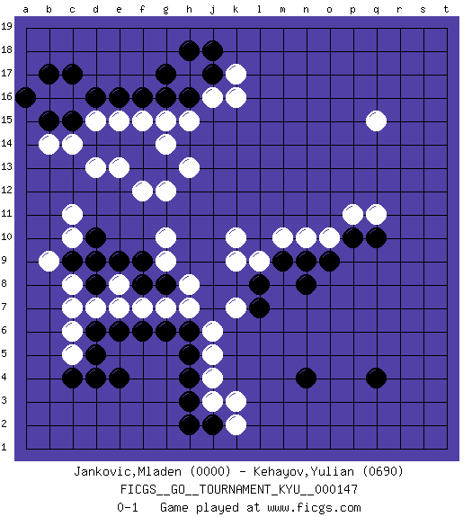 Last move : 0-1 2013 October 7 3:22:40 [Event "FICGS__GO__TOURNAMENT_KYU__000147"] [Site "FICGS"] [Date "2013.05.31"] [Round "1"] [Black "Jankovic,Mladen"] [White "Kehayov,Yulian"] [Result "0-1"] [Rating 1 "0000"] [Rating 2 "0690"] 1.q4 c16 2.d4 q15 3.d10 k3 4.q10 k17 5.d16 d15 6.e16 e15 7.f16 f15 8.g16 g15 9.h16 k16 10.c17 b16 11.b17 h17 12.c15 c14 13.b15 b14 14.a16 k10 15.d14 d13 16.e14 e13 17.f14 g14 18.f13 f12 19.g13 h13 20.j17 g12 21.h18 j16 22.g17 h15 23.j18 d7 24.d6 c6 25.d5 c5 26.c4 c7 27.e4 e7 28.e6 f7 29.f6 g7 30.g6 h7 31.h6 j6 32.h5 j5 33.h4 j4 34.h3 j3 35.j2 k2 36.h2 c10 37.c9 c11 38.d8 c8 39.e9 e8 40.d9 b9 41.f9 g9 42.g8 h8 43.f8 g10 44.n4 o10 45.n8 p11 46.o9 n10 47.n9 q11 48.p10 m10 49.m9 l9 50.l8 k9 51.l7 k7 0-1 This go game has been lost on time (started : 2013.05.31 21:27:13) Here are the names of the openings (joseki) played in the four corners : Corner d16 : c16 d16 Komoku (Somok, Xiao~mu`) 3-4 Point. The komoku (3-4) point is the traditional corner enclosure move.. Corner d4 : d4 d7 Hoshi (Hwajeom, Seongjeom, Xingwei`) 4-4 Point. The star or hoshi (4-4) point, emphasizing influence at the potential expense of territory. Niken Takagakari (Dukan Nop'dakeolch'im, E`r Gaojia, 2-Space High Approach). White 2 is a light approach move. Rarely played in even games, White 2 is typically employed in handicap games. Black continues with 6-4 or 3-10. In Korean Sunjang Baduk Black has a stone on 8-4. Player White won this Go (weiqi, baduk) game. Follow this game move after move (download)Don't be greedy ! (Anonymous) Your best chance to get a Royal Flush in a casino is in the bathroom. (Anonymous)