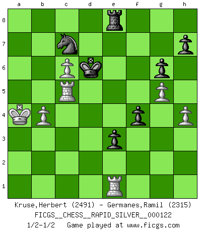 Last move : 1/2-1/2 2013 June 16 17:15:2 [Event "FICGS__CHESS__RAPID_SILVER__000122"] [Site "FICGS"] [Date "2013.06.02"] [Round "1"] [White "Kruse,Herbert"] [Black "Germanes,Ramil"] [Result "1/2-1/2"] [WhiteElo "2491"] [BlackElo "2315"] 1.e4 c5 2.Nf3 d6 3.d4 cxd4 4.Nxd4 Nf6 5.Nc3 a6 6.Be3 e5 7.Nb3 Be6 8.f3 Be7 9.Qd2 O-O 10.O-O-O Nbd7 11.g4 b5 12.g5 Nh5 13.Nd5 Bxd5 14.exd5 f6 15.h4 Ng3 16.Rg1 Nxf1 17.Rdxf1 a5 18.Qd3 a4 19.Nd2 f5 20.Qxb5 Qc7 21.Qc4 Qb7 22.Qc6 Qxc6 23.dxc6 Nb8 24.Nc4 Nxc6 25.Rd1 Ra6 26.Bf2 Rb8 27.a3 Na5 28.Ne3 g6 29.Be1 Kf7 30.Bb4 Rc8 31.Kb1 Nc4 32.Nd5 Bd8 33.Rh1 Ke6 34.f4 Ba5 35.Ka2 Bxb4 36.axb4 Nb6 37.b5 Nxd5 38.bxa6 Ra8 39.fxe5 dxe5 40.c4 Ne3 41.Rc1 Rxa6 42.c5 e4 43.c6 Ra8 44.Rhe1 Nd5 45.Red1 Rc8 46.Ka3 e3 47.Rc5 Nc7 48.Kxa4 f4 49.Re1 Kd6 50.b4 Re8 51.Rd1+ Ke6 52.Re1 Kd6 53.Rd1+ Ke6 54.Re1 Kd6 1/2-1/2 Sicilian : Najdorf, Byrne (English) attack Kingside Castling by player Black (move 9) Queenside Castling by player White (move 10) This chess game ended in a draw. Follow this game move after move (download)The laws of Chess do not permit a free choice: you have to move whether you like it or not. (Emanuel Lasker) Schach ist ein schwarz-weisser Dschungel. (Garry Kasparov) Del Ajedrez se ha dicho que la vida no es lo suficientemente larga para él, pero eso es culpa de la vida, no del Ajedrez. (William Ewart Napier) Les Echecs ne sont pas pour les âmes timides. Ils requièrent un homme entier, qui ne s'arrête pas aveuglément à ce qui a été déjà établi, mais qui tente individuellement de sonder les profondeurs du jeu. (W. Steinitz) You can only get smarter by playing a smarter opponent. (Revolver, movie)