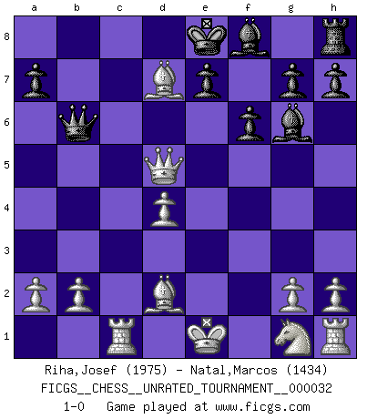 Last move : 1-0 2013 August 26 12:41:36 [Event "FICGS__CHESS__UNRATED_TOURNAMENT__000032"] [Site "FICGS"] [Date "2013.06.02"] [Round "1"] [White "Riha,Josef"] [Black "Natal,Marcos"] [Result "1-0"] [WhiteElo "1975"] [BlackElo "1434"] 1.d4 d5 2.e4 dxe4 3.Nc3 Nf6 4.Bg5 Bf5 5.f3 exf3 6.Qxf3 Bxc2 7.Qxb7 Nbd7 8.Nb5 Nd5 9.Qxd5 f6 10.Bc4 Qc8 11.Nxc7+ Qxc7 12.Qxa8+ Nb8 13.Qd5 Bg6 14.Bb5+ Nd7 15.Rc1 Qa5+ 16.Bd2 Qb6 17.Bxd7+ 1-0 This chess game has been lost on time (started : 2013.06.02 12:49:44) Blackmar gambit Player White won this chess game. Follow this game move after move (download)After a bad opening, there is hope for the middle game. After a bad middle game, there is hope for the endgame. But once you are in the endgame, the moment of truth has arrived. (Edmar Mednis) Die westlichen Werte sind eine Sprache, welche die Putin-Administration nicht versteht. (Garry Kasparov) El Ajedrez es como la guerra en un tablero. (Bobby Fischer) Les erreurs sont comme les malheurs, elles n'arrivent jamais seules. (Siegbert Tarrasch) Hello Thibault, if I have had a plan (and I had one, I hope), I have forgotten it during the last week... - Hello Heinz-Georg. What do you mean a plan ? (Anonymous players, during a Big Chess game)