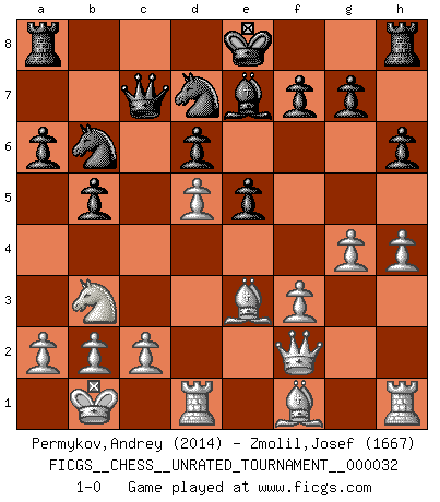 Last move : 1-0 2013 September 10 13:51:31 [Event "FICGS__CHESS__UNRATED_TOURNAMENT__000032"] [Site "FICGS"] [Date "2013.06.02"] [Round "1"] [White "Permykov,Andrey"] [Black "Zmolil,Josef"] [Result "1-0"] [WhiteElo "2014"] [BlackElo "1667"] 1.e4 c5 2.Nf3 d6 3.d4 cxd4 4.Nxd4 Nf6 5.Nc3 a6 6.Be3 e5 7.Nb3 Be6 8.f3 Be7 9.Qd2 Nbd7 10.g4 h6 11.O-O-O b5 12.h4 Nb6 13.Qf2 Nfd7 14.Kb1 Qc7 15.Nd5 Bxd5 16.exd5 1-0 Sicilian : Najdorf, Byrne (English) attack Queenside Castling by player White (move 11) Player White won this chess game. Follow this game move after move (download)Chess, like love, is infectious at any age. (Flohr) Vielleicht wirkt die Aura früherer Spieler glanzvoller als die der heutigen Spieler, aber das liegt daran, dass man kein Programm wie Fritz hatte, das einem all die Löcher in ihren Partien zeigt. (Vladimir Kramnik) Después de una mala apertura, hay una esperanza en el juego medio. Pero una vez que estas en finales, el momento de la verdad ha llegado. (Edmar Mednis) 'L'échange des dames est un coup dur pour les deux adversaires...' Un journaliste lors d'une partie du match Spassky-Fischer It's not the size of the dog in the fight, it's the size of the fight in the dog. (Mark Twain)