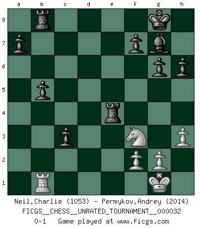 Last move : 0-1 2013 August 8 19:38:41 [Event "FICGS__CHESS__UNRATED_TOURNAMENT__000032"] [Site "FICGS"] [Date "2013.06.02"] [Round "1"] [White "Neil,Charlie"] [Black "Permykov,Andrey"] [Result "0-1"] [WhiteElo "1053"] [BlackElo "2014"] 1.Nf3 d5 2.c4 c6 3.d4 Nf6 4.Nc3 e6 5.Bg5 h6 6.Bxf6 Qxf6 7.e3 Nd7 8.Bd3 dxc4 9.Bxc4 g6 10.Qe2 Bg7 11.O-O O-O 12.b4 Qe7 13.Rfc1 Qxb4 14.Bb3 b6 15.Rab1 Qe7 16.e4 Rb8 17.d5 exd5 18.exd5 Qxe2 19.Nxe2 c5 20.Rd1 b5 21.Nf4 Nb6 22.h3 Rd8 23.d6 Bf5 24.Nd5 Nxd5 25.Bxd5 Bxb1 26.Rxb1 c4 27.Bc6 Rxd6 28.Be4 Ra6 29.a4 Rxa4 30.Bc6 c3 31.Be4 Rxe4 0-1 Reti Opening Kingside Castling by player White (move 11) Kingside Castling by player Black (move 11) Player Black won this chess game. Follow this game move after move (download)Spassky will not be psyched out by Fischer. (Mike Goodall) Ich liebe den Moment, wenn ich das Ego meines Gegenüber breche. (Robert James Fischer) En el tablero, la mentira e hipocresía no sobreviven mucho. (Emanuel Lasker) J'ai toujours senti une vague pitié pour l'homme qui ne connaît rien aux échecs, tout comme j'en aurais pour un homme ignorant de l'amour. Les Echecs, comme la musique ou comme l'amour, ont le pouvoir de rendre heureux. (Siegbert Tarrasch) If we knew what we were doing, we would not call it research. (Albert Einstein)